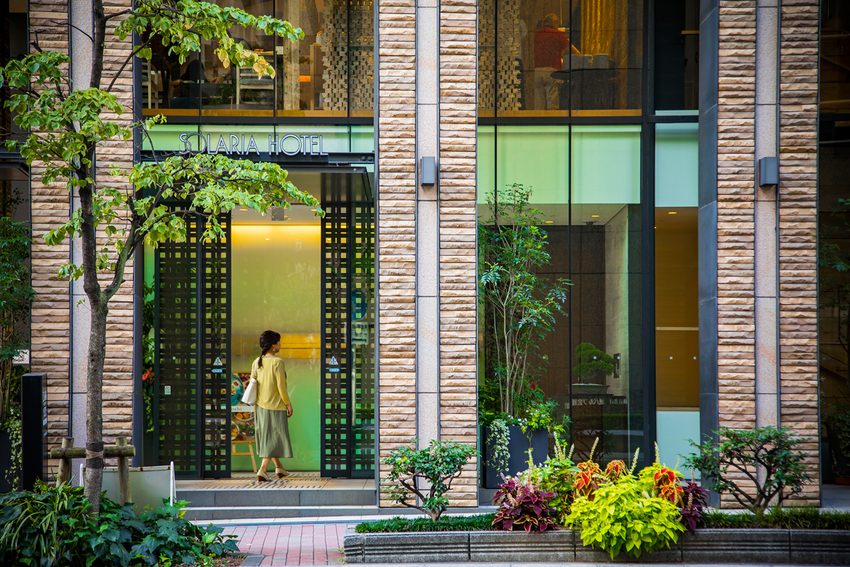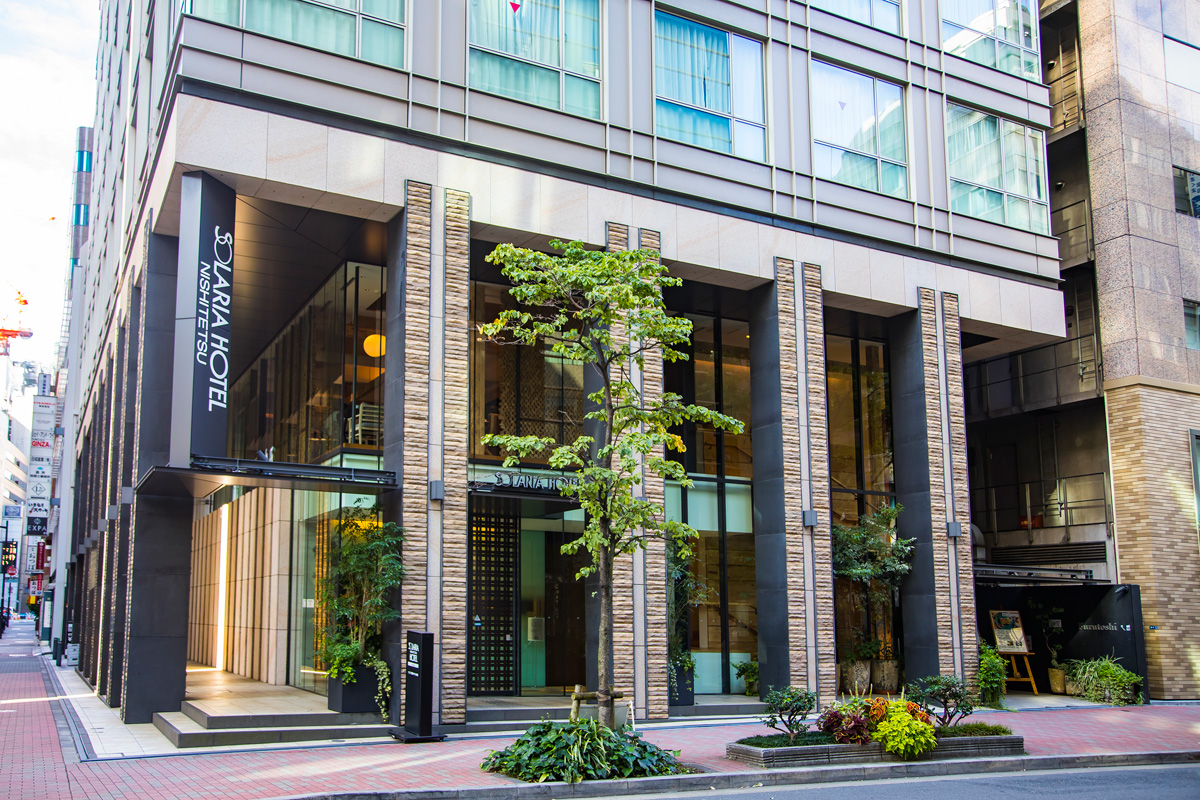 宿泊するのは、銀座駅から2分、晴海通りから1本入った通りに面した「ソラリア西鉄ホテル銀座」。銀座の街並みと調和した、スタイリッシュなエントランスから館内へ。1階にフロント、2階にレストラン、3~13階に客室があります。