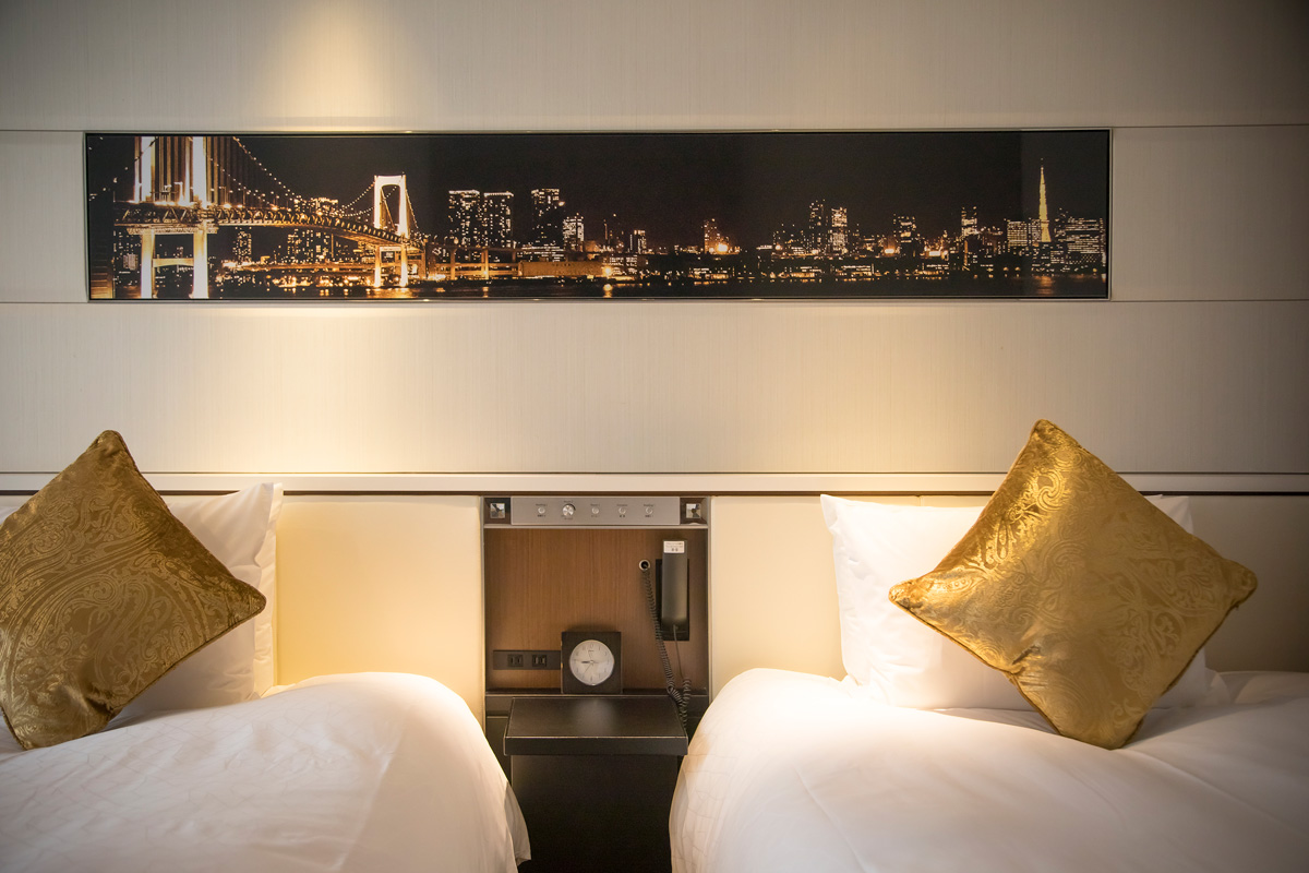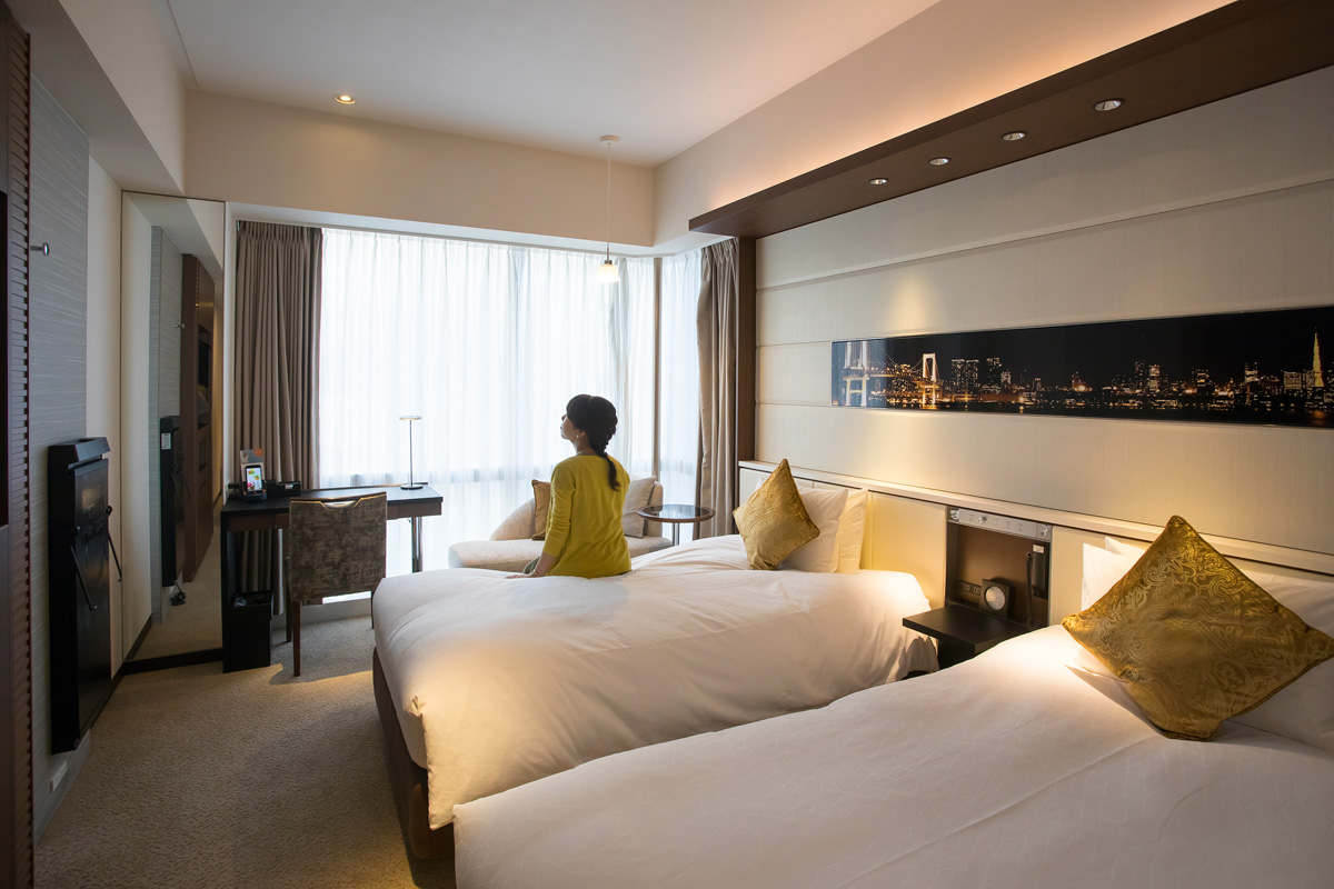 客室はシングル、ダブル、ツインなど5タイプ全207室。写真は24㎡のツインルームで、ライティングデスクやソファを置いてもゆったりとした広さ。女子旅や親子旅に最適です。