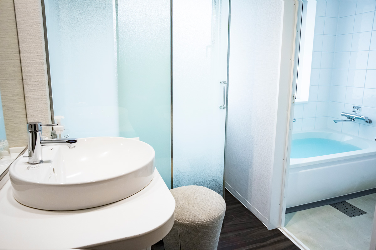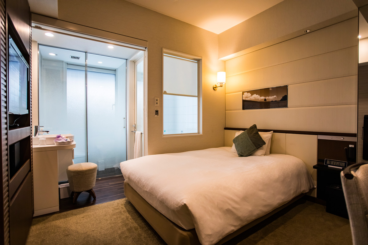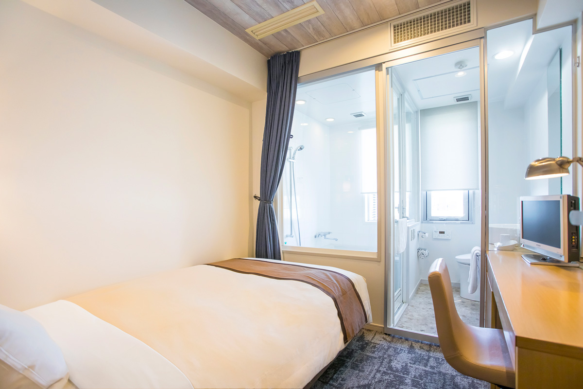 一人旅なら広さ15.4㎡にセミダブルベッドを備えたシングルルームがおすすめ。バス・トイレ・洗面台が別々で、ガラス窓を効果的に使っているので圧迫感がなく、すっきり。
