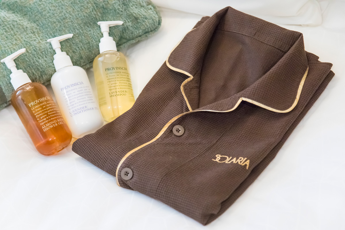 バスソルトやラベンダーの香りのシャンプーなどを使って、ゆっくりとお風呂タイム。肌触りのいいタオルやワンピースタイプのナイトウェアも揃っています。