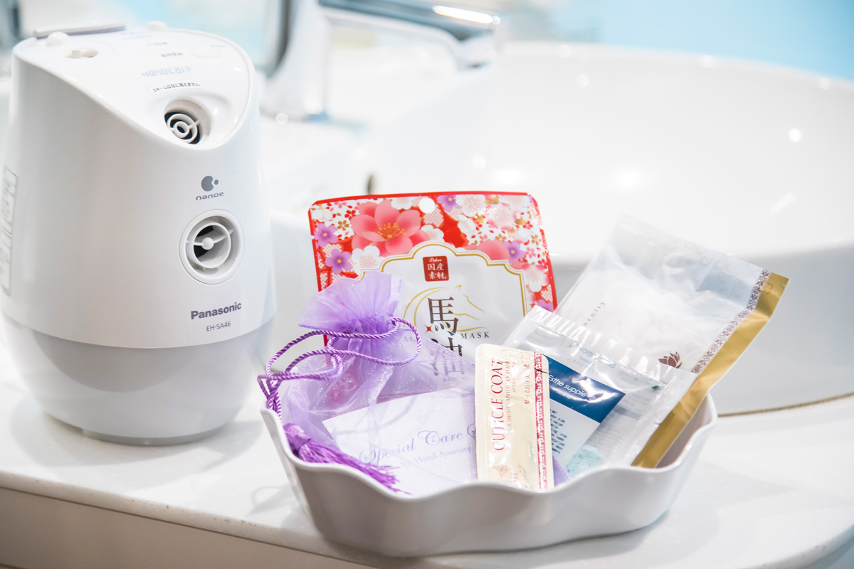 メイク落としや化粧水、乳液、ヘアゴム、ヘアトリートメント、マイナスイオンドライヤー、バスソルトは全室に用意。さらに女性専用フロアの客室には、フェイスマスクや美顔スチーマー、ヘアターバンといった女子に嬉しいアメニティまであるんです! ゆったりとバスタイムを過ごして、キレイに磨きをかけましょ。