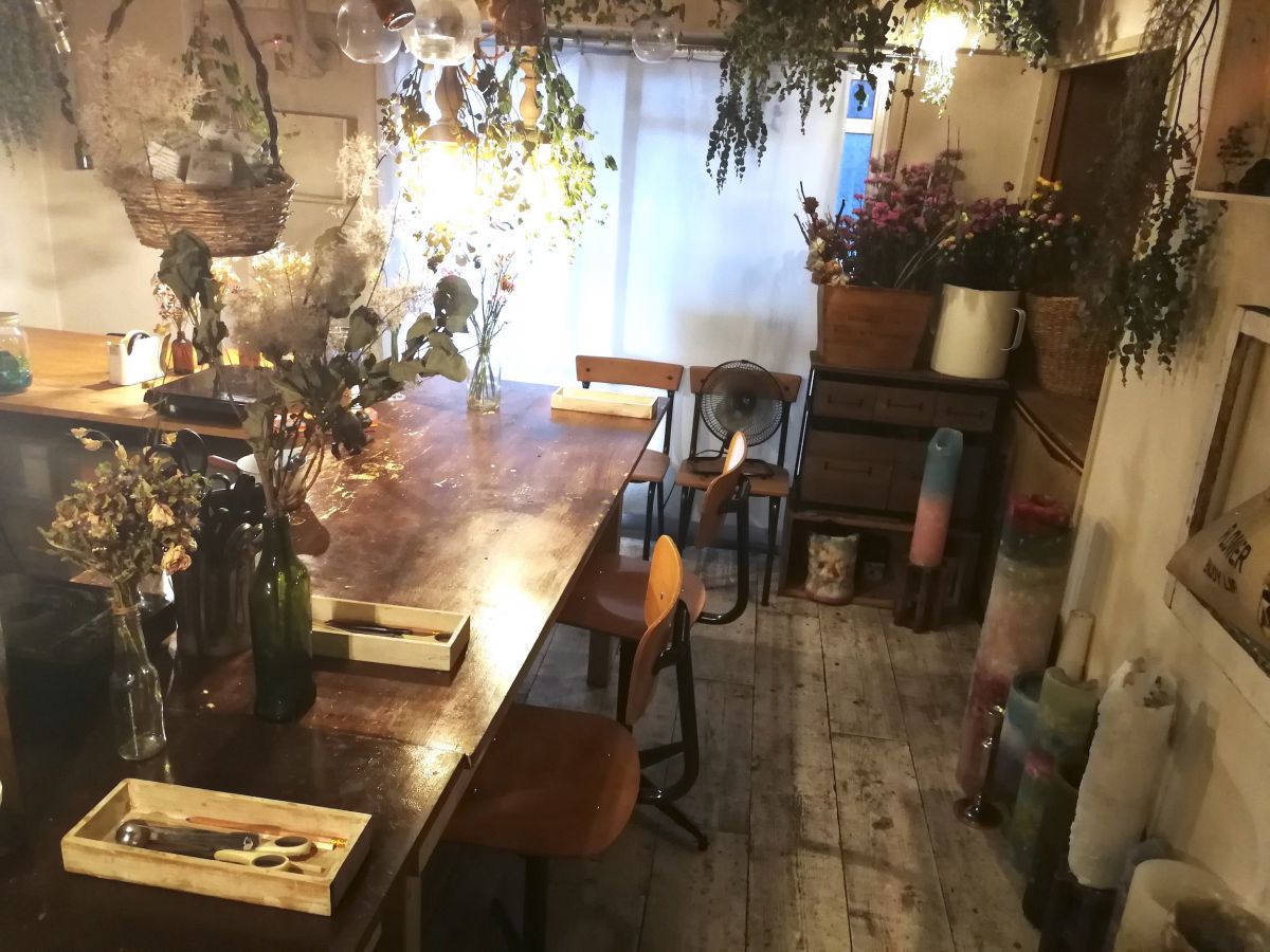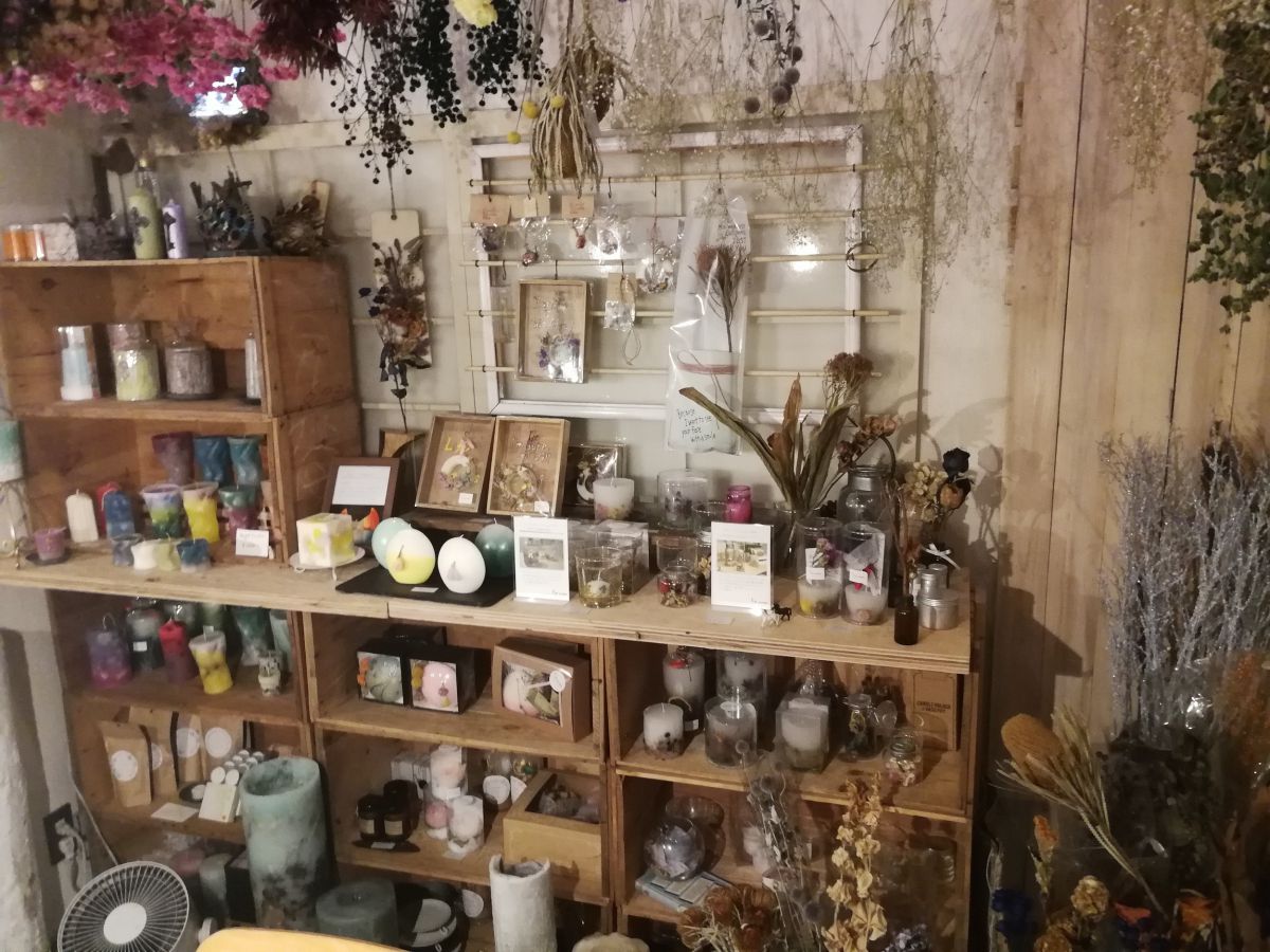 お店は、西鉄福岡駅から歩いて5分、今泉地区のマンションの2階にあります。自家製のドライフラワーが並ぶ温かみのある空間は、まるで隠れ家のよう。少人数、予約制レッスンとあって、キャンドルについてじっくり学ぶのに最適です。