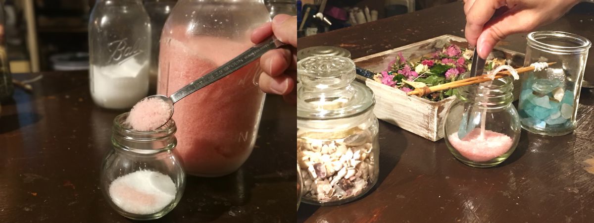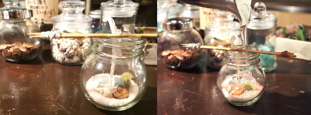 まずは砂浜をイメージしながら、ブルーやイエロー、ブラウンなど色とりどりのパウダー状のロウを入れていきます。今回は白とピンクをチョイス。次に、キャンドルの芯をセット。その上にビーズや貝殻、ドライフラワー、シーグラスなどをチョイスし、キャンドルをデザインしていきます。