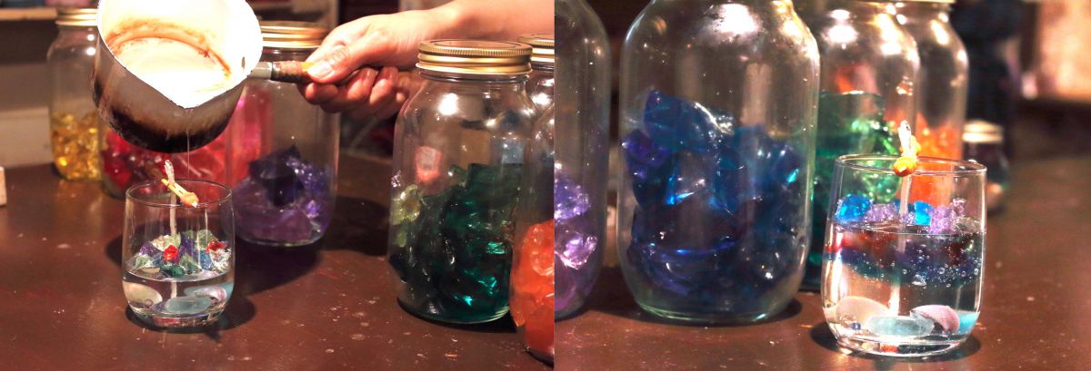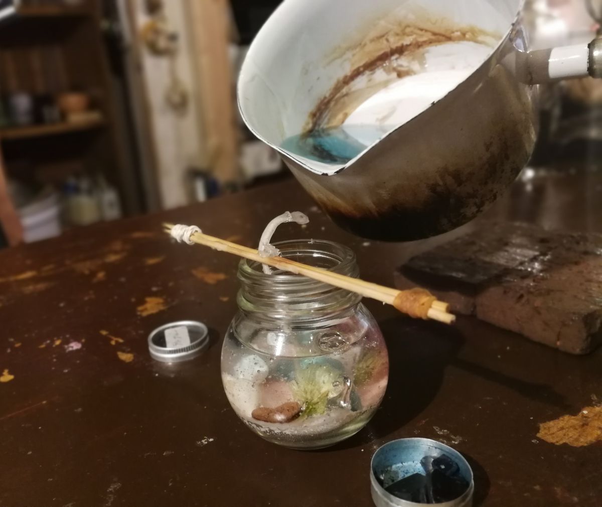 その上に、キャンドル用の染料を溶かしたジェルワックスを流し込んでいきます。きれいなグラデーションになるように、染料を増やして色を濃くしたジェルワックスを2、3回に分けて注ぎ入れます。