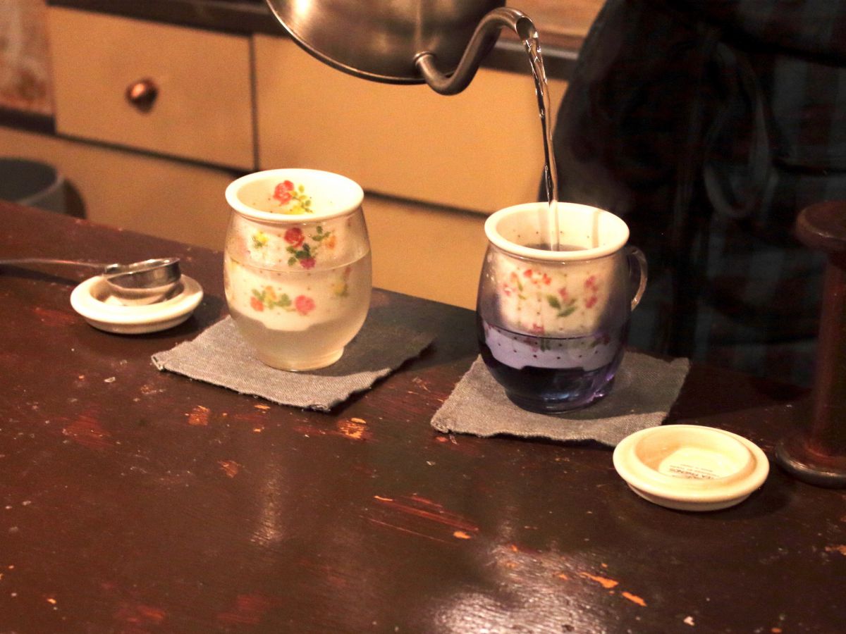 キャンドルが冷めるまでの時間は、ティータイムを満喫。ドリンクは、カフェのように数種類ある中から選べます!ブレンドも可能なハーブティーは、ジンジャー、ローズ、レモンピール、マローブルーなどがありますよ。