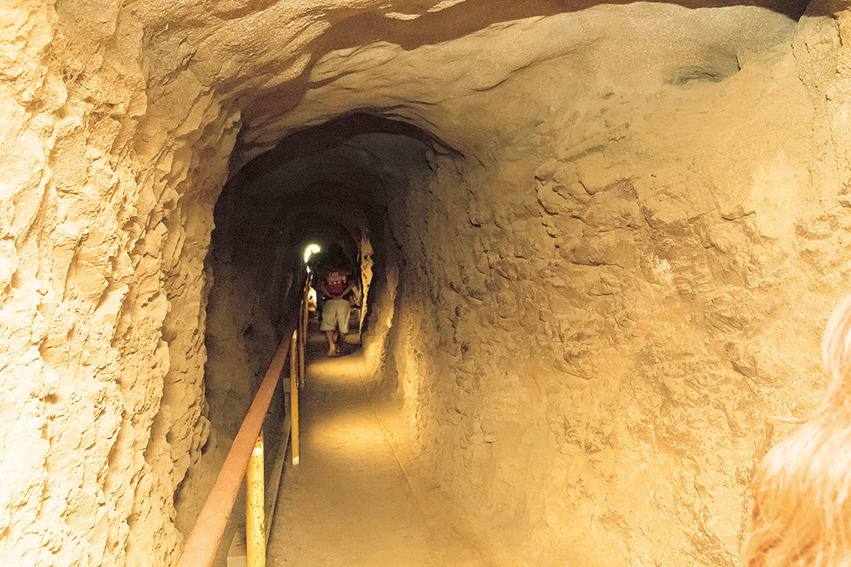 70数段の長い階段を登りきると50mほどの短いトンネルに入ります。天井が低いので腰をかがめて進みます。足元にも気を付けて。