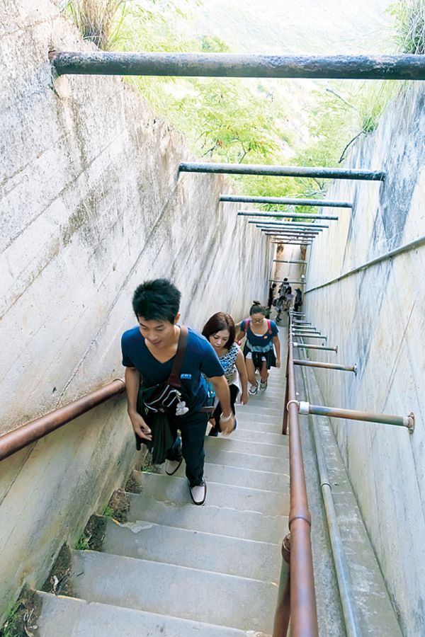 トンネルを抜けると次に現れるのが99段の急な階段です。体力に自信のない人向けに、左側に延びる緩やかな坂道の迂回路もあります。
