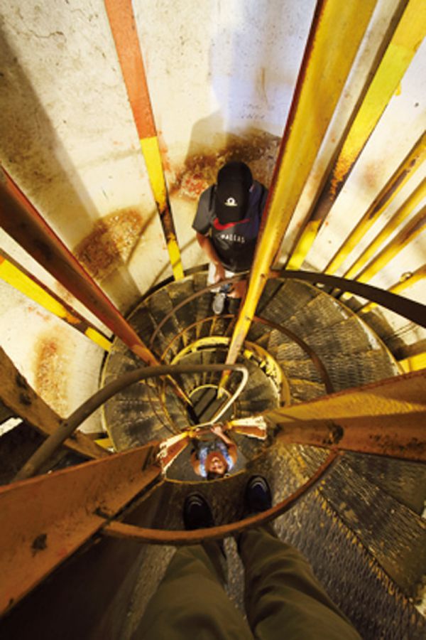 建物内にあるらせん階段を3階分上ります。ここが頑張りどころ。99段の階段を回避してう回路を行くのもあり。途中絶景も見えるので、当日の体調に合わせて選びましょう。