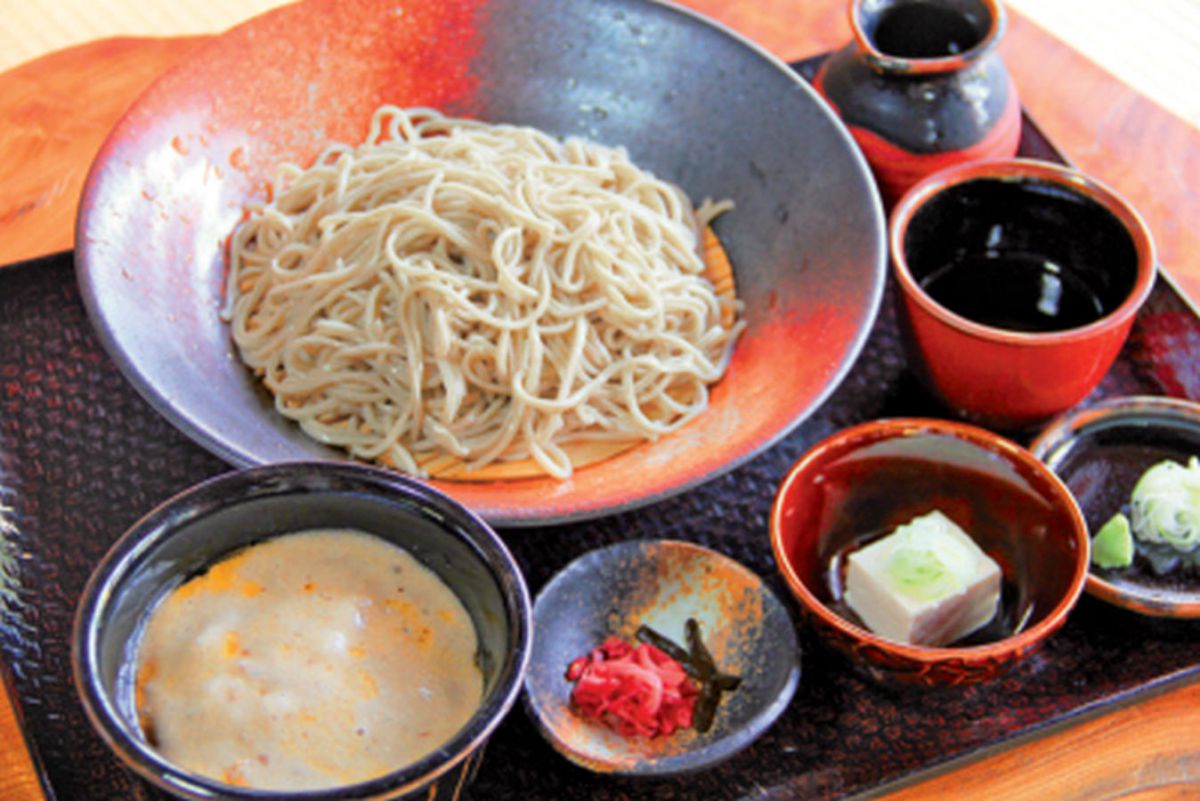 せせらぎ公園駐車場の手前にあるそば処。自然薯とろろご飯とざるそばのセット1300円は、香り高くコシのあるそばに、もっちり食感のとろろご飯の相性がよく、食べ応え満点でイチオシです。もっとがっつり食べたい人には、飛騨牛ミニステーキ丼と自然薯とろろそばのセット2600円もあります。