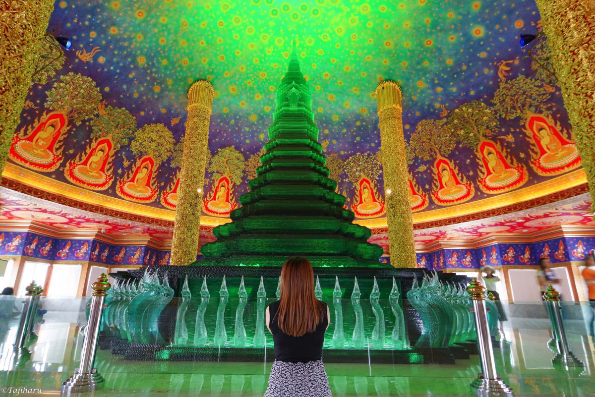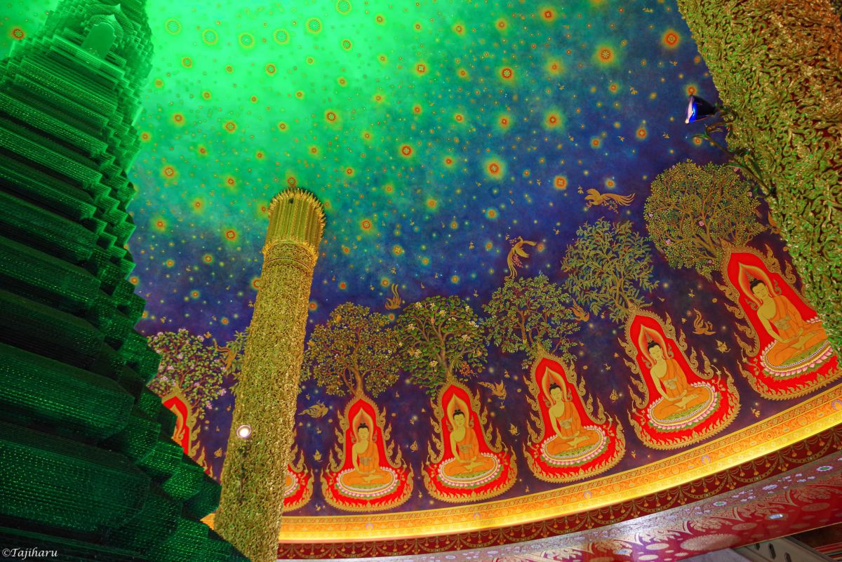 下層階には瞑想用のホールや博物館などがありますが、なんといっても必見は、最上階にあるエメラルドの仏塔とカラフルな天井画。お寺とは思えない鮮やかな色彩で、宇宙や仏をイメージしたものが描かれています。