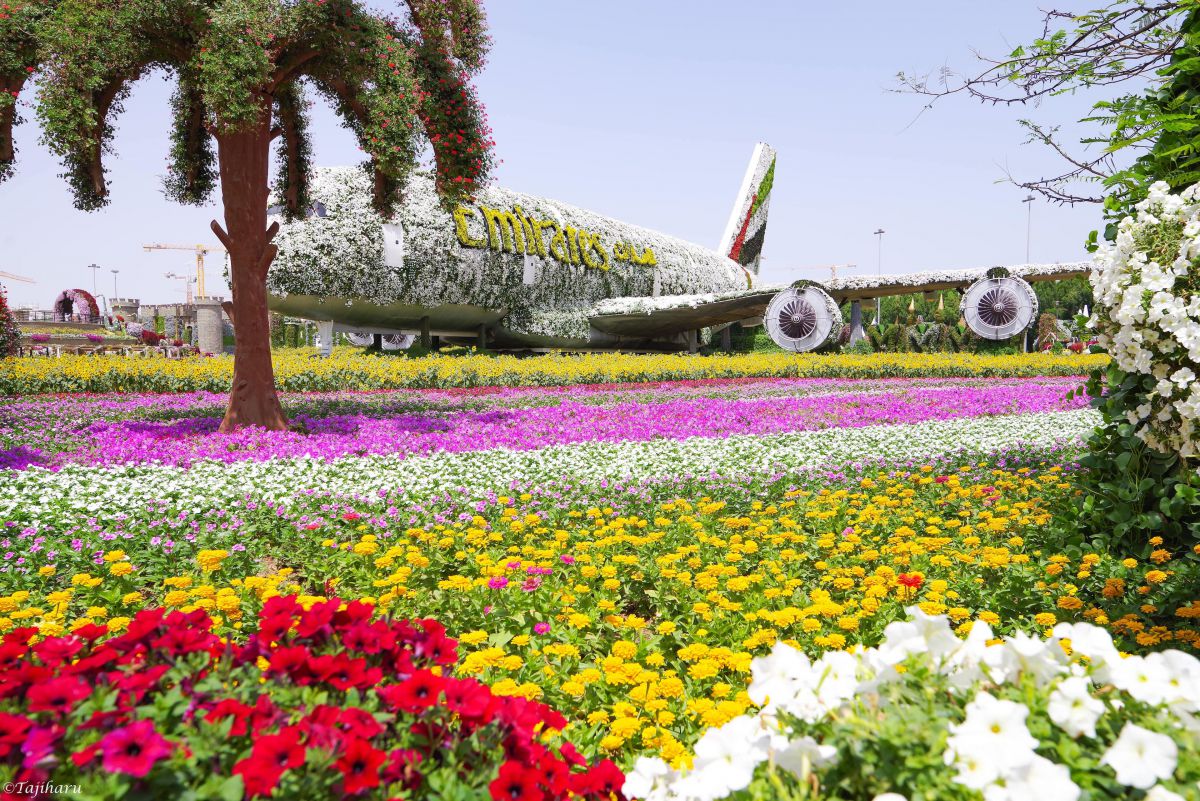 約5000万本もの花が植えられていて、カラフルな花のアートが楽しめます。みどころのひとつが、花で造られたこのエミレーツ航空の機体。ドバイらしい規格外のスケールで楽しめるカラフルスポットです!