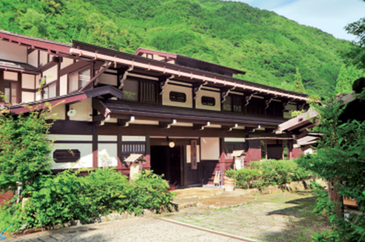 福地温泉にあり、築150年の庄屋屋敷を移築し存在感のある母屋。入口の先には風格あるロビーが広がります。飛騨と新潟から15もの古民家を移築しており、囲炉裏や火鉢を据えた客室は趣たっぷり。共同源泉のほかに自家源泉を3本持ち、内湯と露天風呂で豊かな温泉を満喫できますよよ。