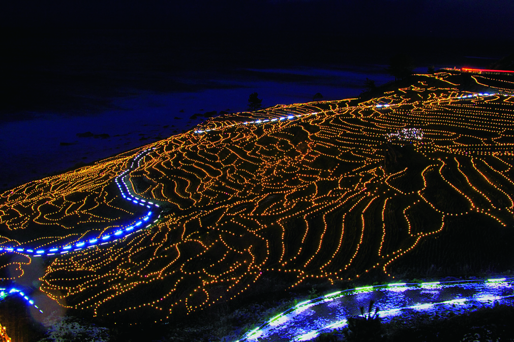 収穫の終わった棚田では、毎年10月中旬~3月中旬にイルミネーションイベント「あぜのきらめき」を開催しています。毎日、日没後に灯りがともり、真っ暗闇に浮かぶイルミネーションは幻想的な風景を演出します。また、雪の積もった棚田も美しいんですよ。