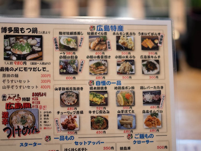串のほかには牡蠣や小イワシ、ホルモンの天ぷら、がんすなど、広島の特産を味わうことができるメニューも。広島ならではの食材を楽しめるところも、「カープ鳥」が観光客に人気の理由です。