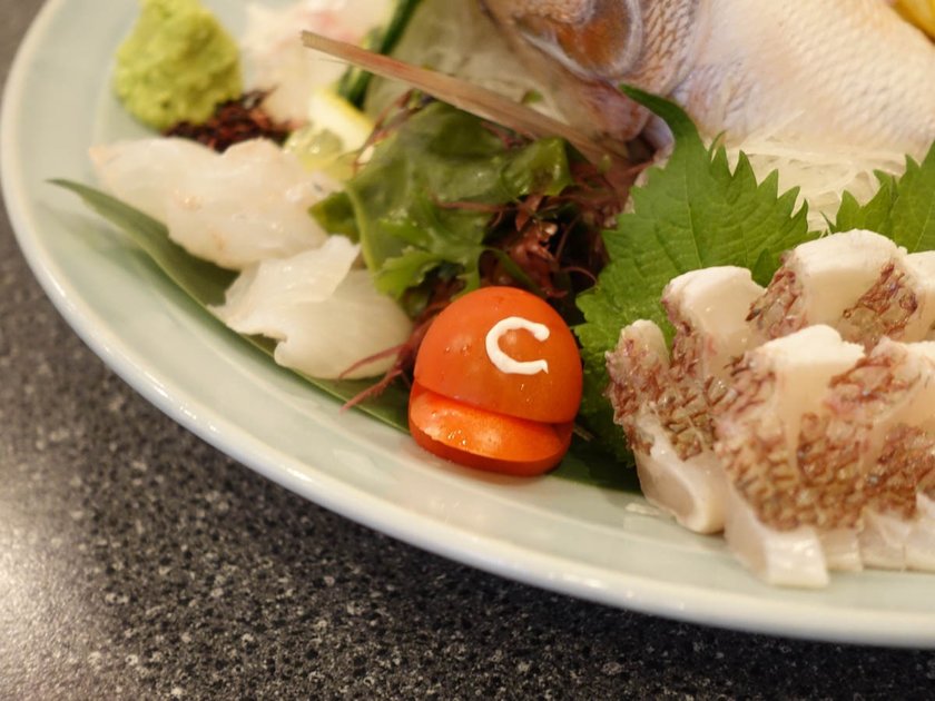 飲み放題付きのコースを頼むと、豪華なお刺身も出てきます。プチトマトでできたカープ帽の飾りがかわいい。こういった小さな遊び心にも注目です!
