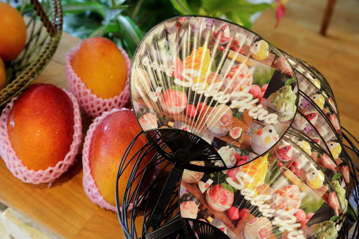 店内に飾られた新鮮なフルーツ。マンゴー、イチゴなど旬のフルーツのかき氷が充実しています。「美と健康」のため、保存料や着色料などは使いません。