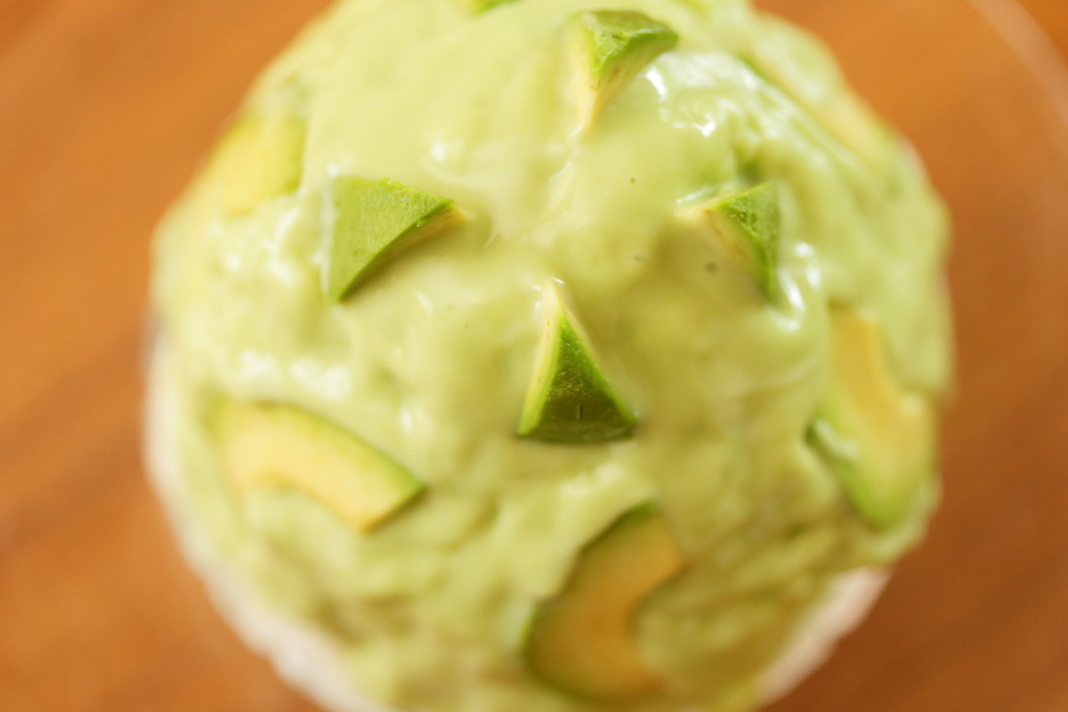 氷はサラサラの粉雪タイプ。48時間かけて凍らせた純氷はクリアな味わいです。削ってはアボカドのソースをかけて…と繰り返すこと4~5回。なかまで濃厚なソースが染みわたります。