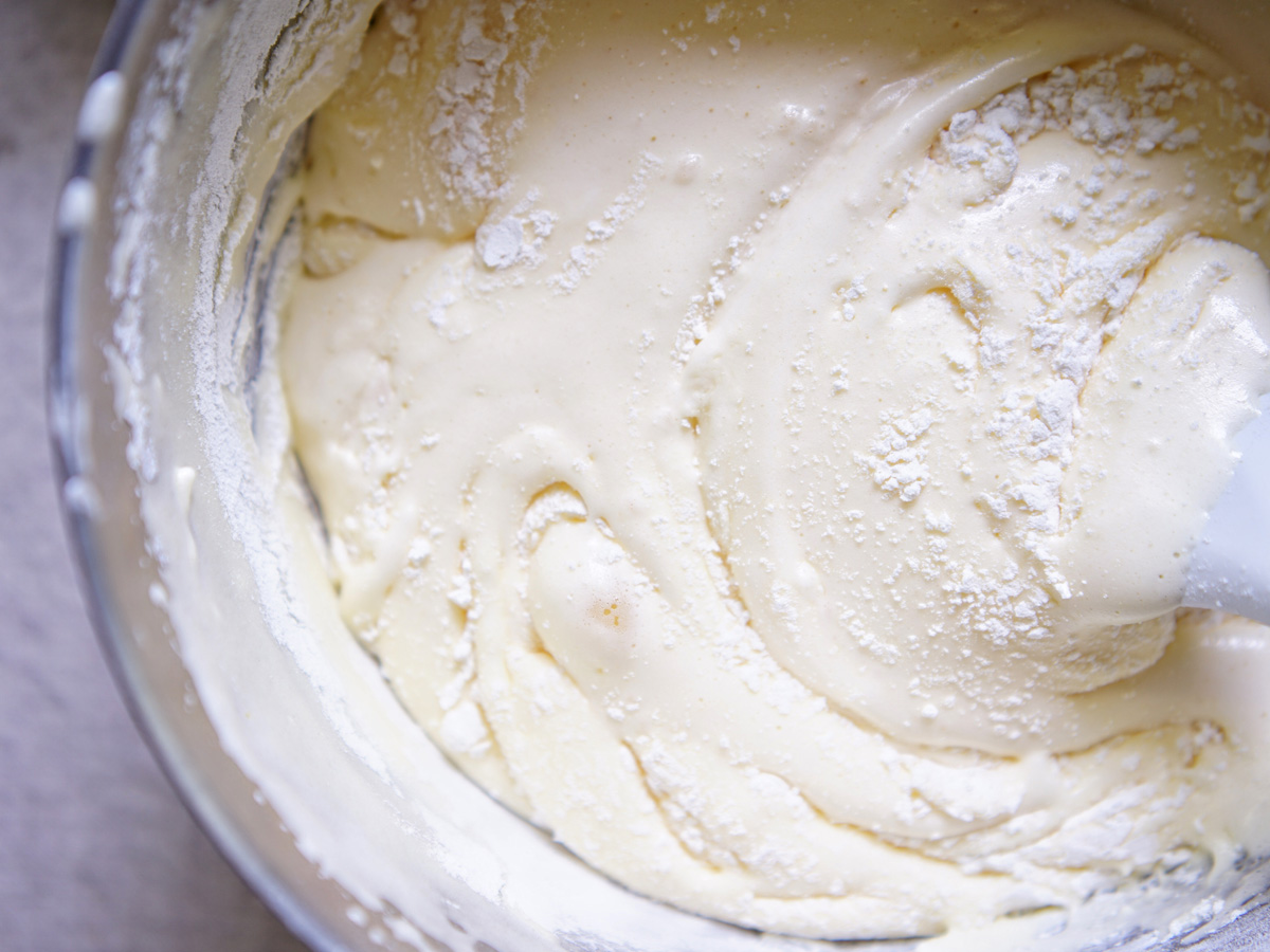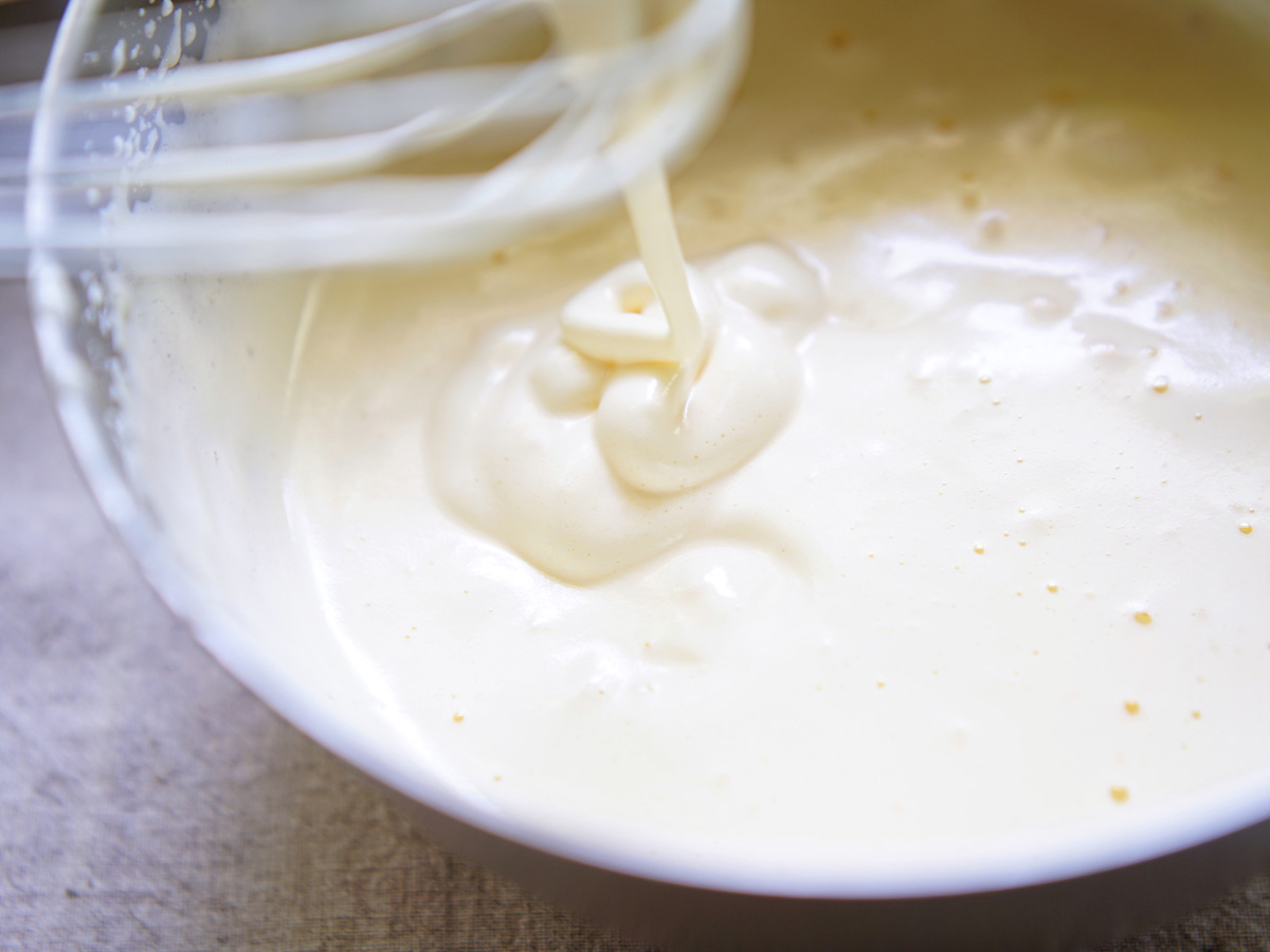 牛乳とバターを合わせたものを加え、さらに混ぜます。均一な生地になるように、底からしっかり混ぜてください。