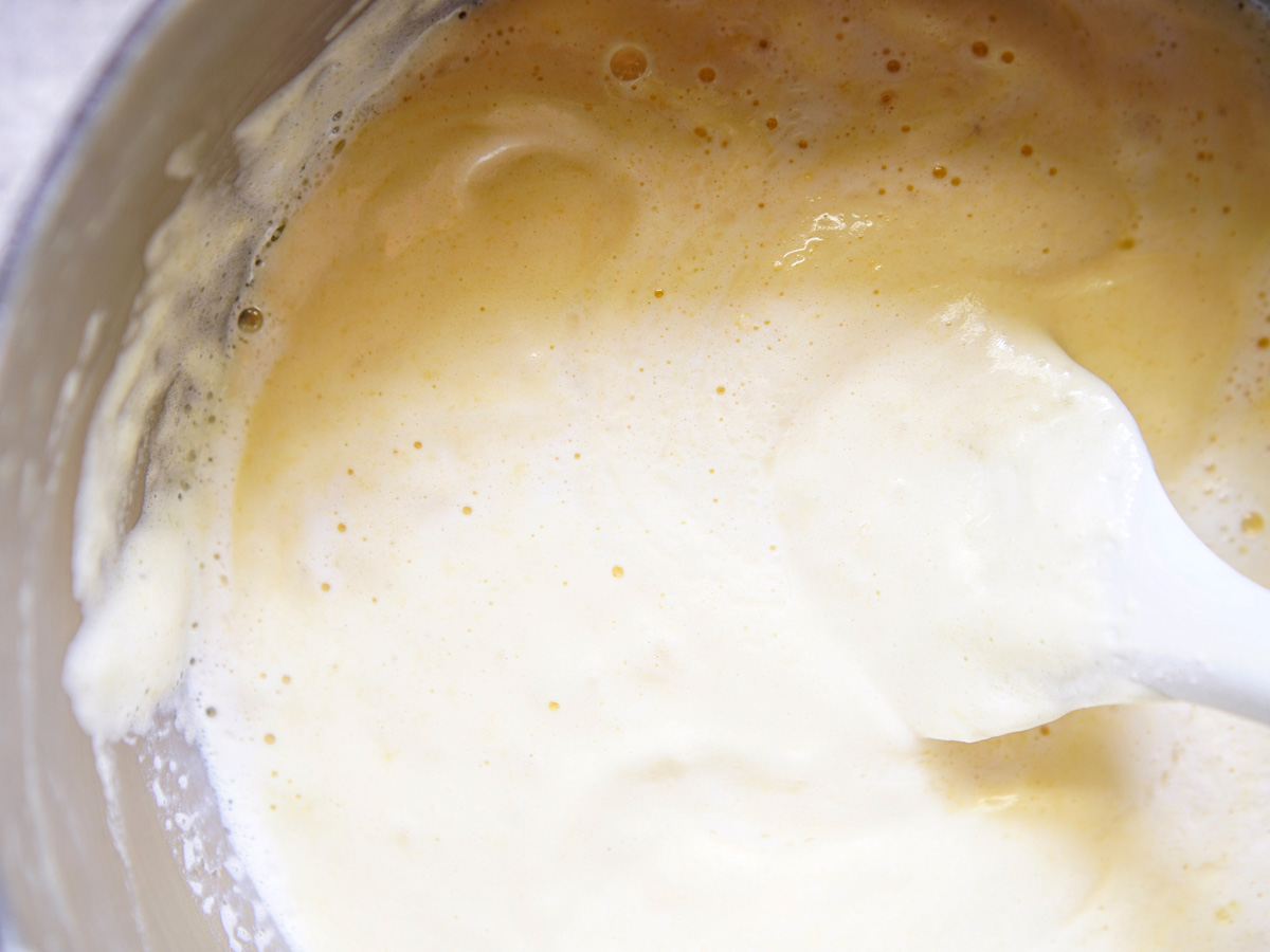 35℃になったら湯煎から下ろし、泡立て器でもったりするまで泡立てます。