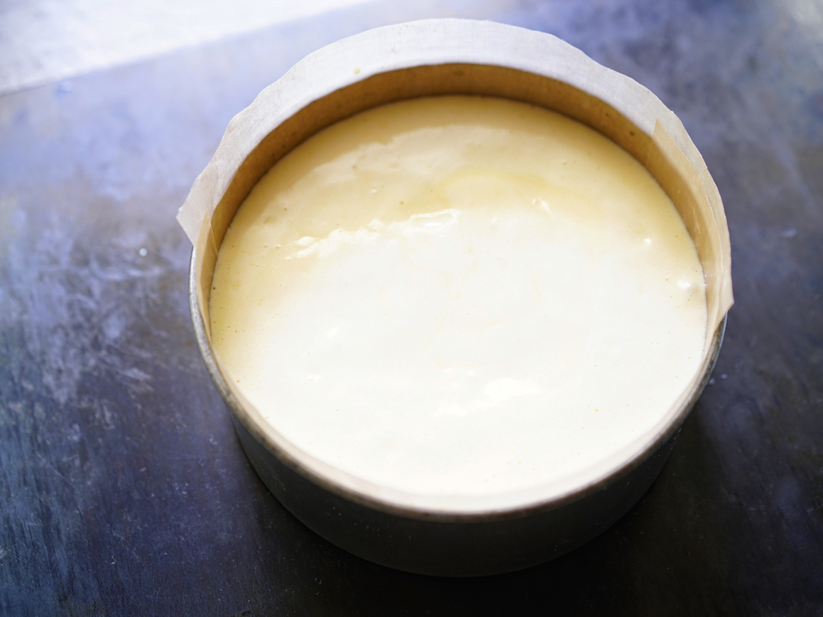 型に流し込み、10㎝くらいの高さからトンと軽く落として、大きな気泡を抜きます。