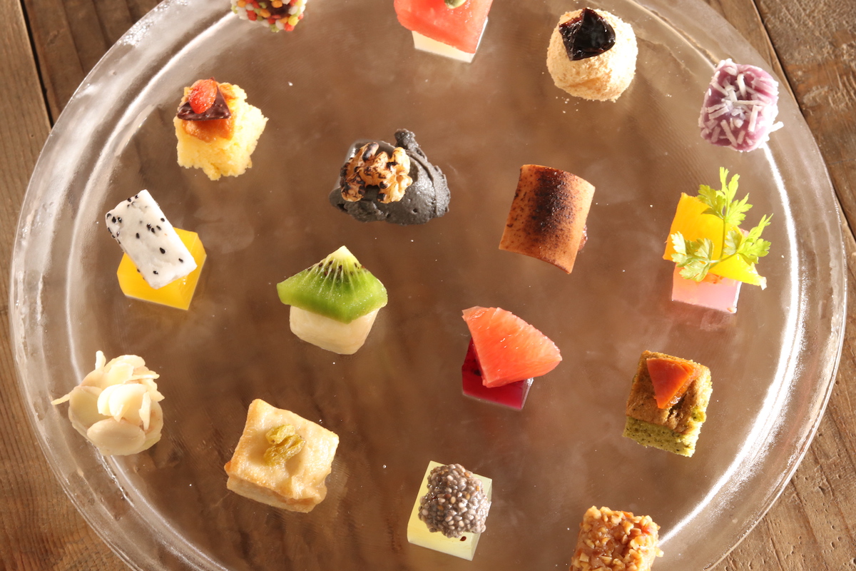 おやつは、キウイやデコポンなどの果実と、クコの実やチアシードなどの木の実を使用し、寒天や餡、葛餅やシフォンケーキに仕立てられています。 崩してしまうのがもったいないほど華やかでかわいいルックス……!