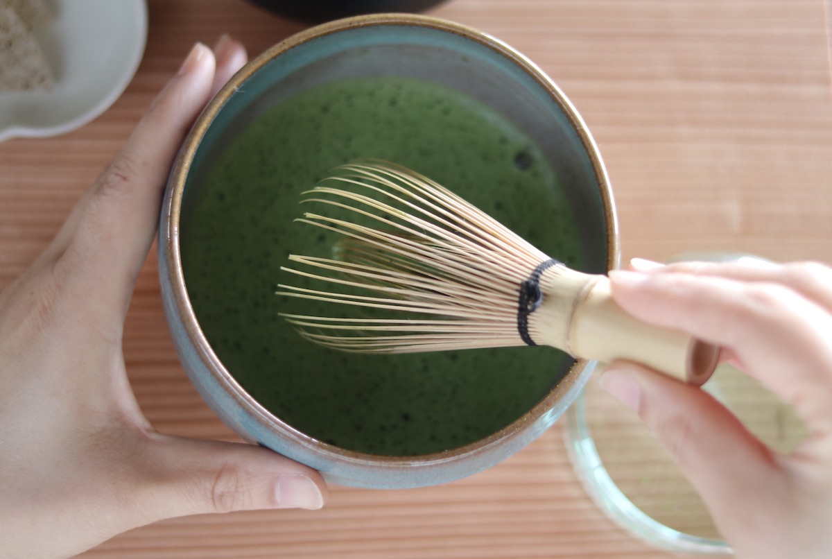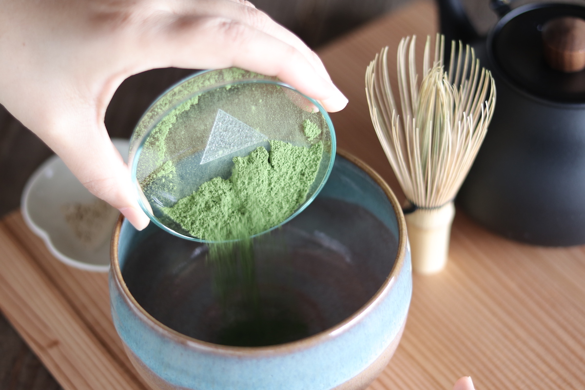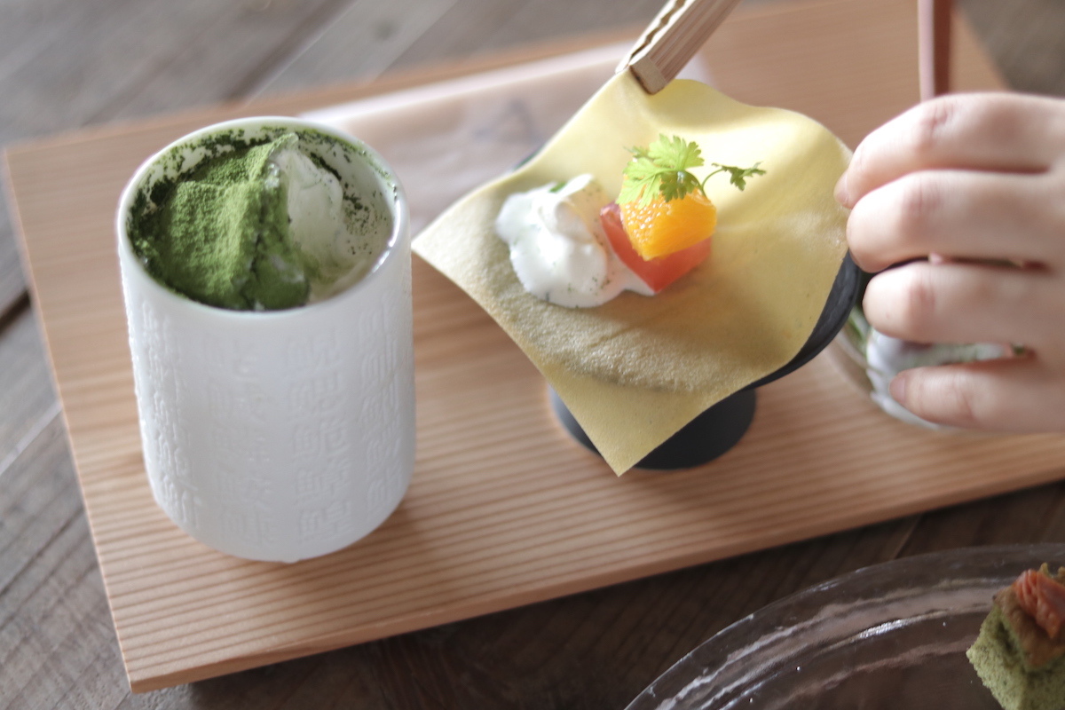 「手織り果子」だけでなく、ドリンクも自分で作り上げるのが「AWOMB こころみ」のスタイル。自分でおうすを点てられる「手前点前」は、京都の日本茶専門店「一保堂茶舗」の抹茶と、こころみ自家製のお干菓子・琥珀糖が添えられています。