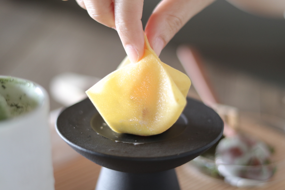 果子作りは、感性が赴くままに。今回はクレープで寒天のおやつと乳餡を包んで巾着にし、パクリ。さらりとしたクレープとねっとり濃厚な乳餡、寒天の涼やかな食感が相まって、食べ終わるのが惜しいおいしさです!