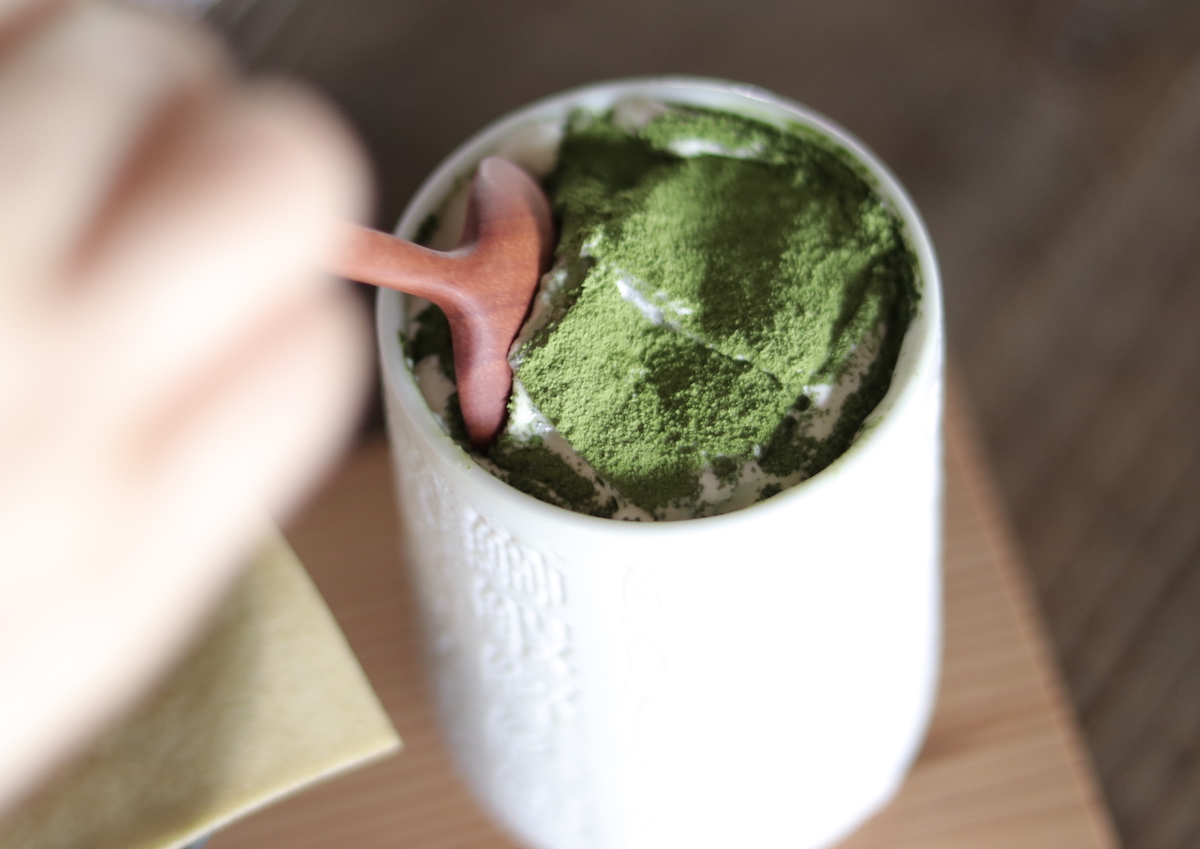 乳餡は、まるでチーズケーキのようなリッチな味わい。器の底にはまろやかな豆乳ゼリー、その上に豆乳クリームとたっぷりの乳餡、いちばん上が求肥と抹茶で、この器だけでもパフェのような重層的な味わいです。そのまま食べておいしいのはもちろん、溶けた状態をお汁粉のような感覚で飲み干すのもおすすめ。