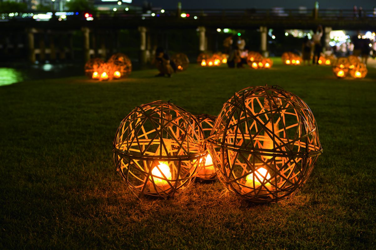 京都の中心を流れる鴨川の河川敷に、置かれた竹かごの中からやさしく漏れる灯り。竹かごには、京焼・清水焼や京仏具の伝統技術で作られた風鈴が吊られていて、涼やかな音色を奏でます。
