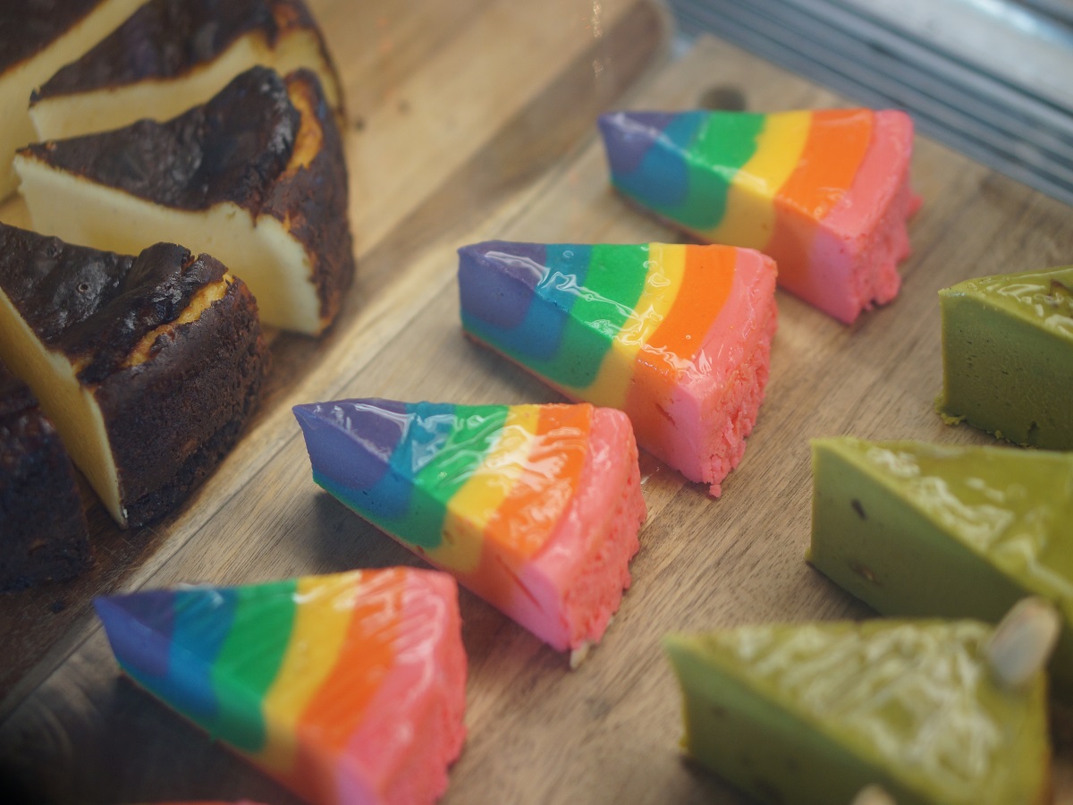 ショーケースのなかには、「A WORKS」の看板メニュー「レインボーケーキ」をはじめとしたかわいいチーズケーキが並んでいます。