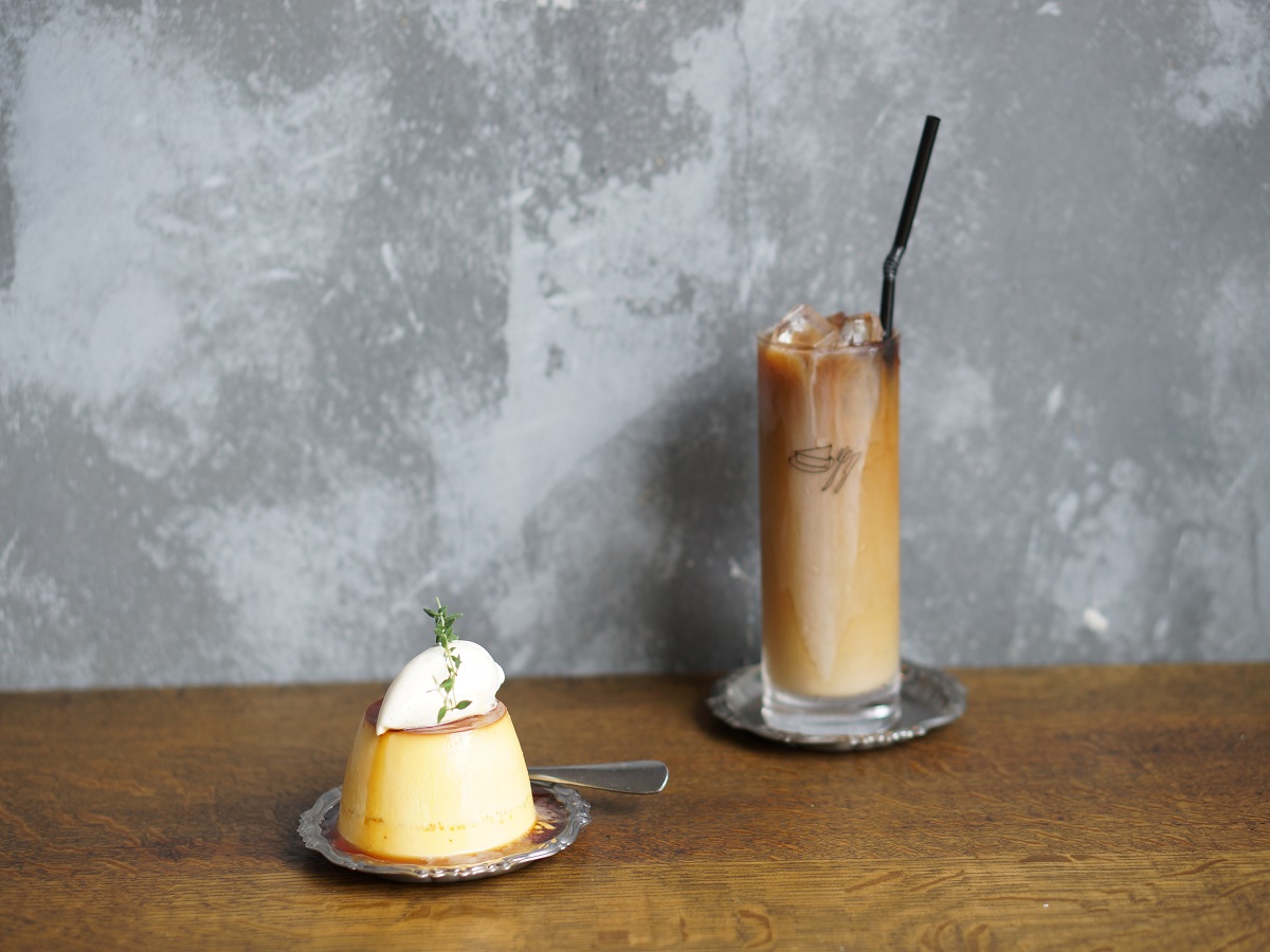 こちらがその「プリン」600円(税込)と「アイスコーヒー」500円(税込)。ちなみにアイスコーヒーのグラスはオリジナルなんだそう。そんなこだわりもうれしいですね。