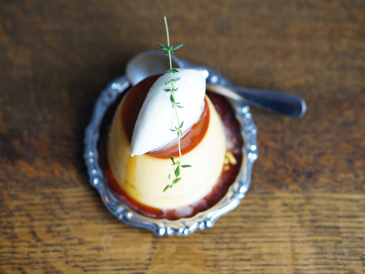 ハーブの効いたカラメルソースとチーズクリームが絶品のプリン