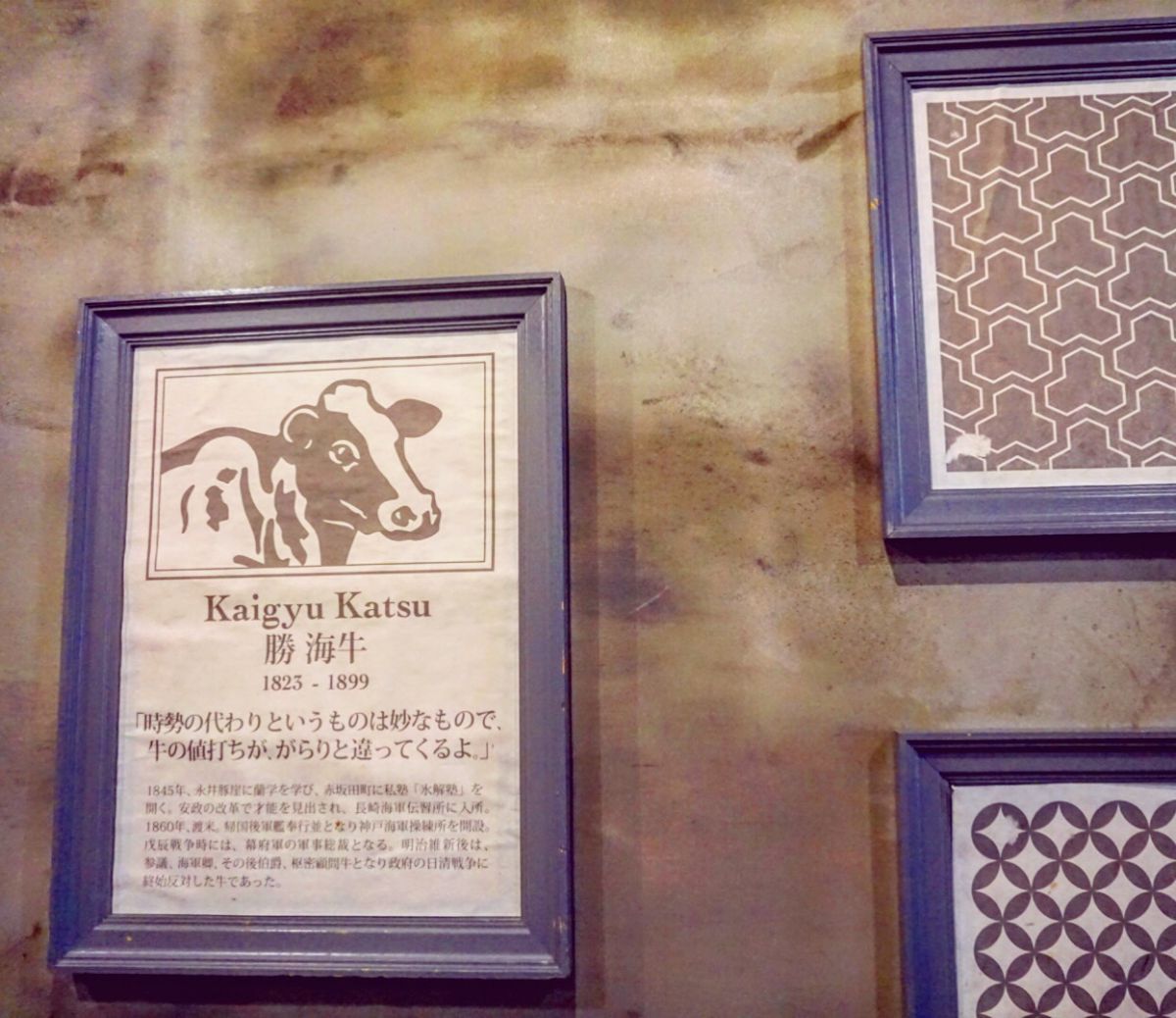 壁には牛や豚を歴史上の人物になぞらえた「勝海牛」「織田信豚長」「紫式豚」などのポスターが貼ってあります。