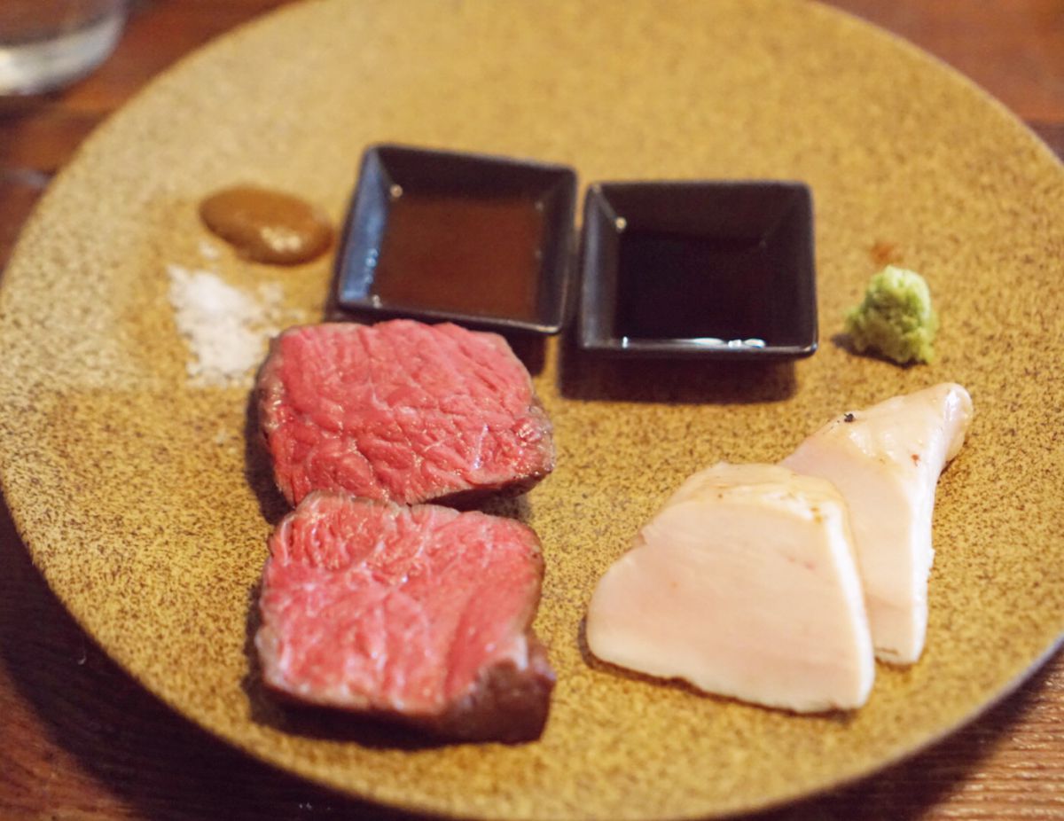 うまみと香りがぎゅっと凝縮した赤身の熟成牛に、柔らかでスモーク感あふれる熟成鶏。こちらのステーキは、5種の調味料を合わせて楽しみます。その5種がまたバリエーション豊か!鰹節と鯖節を使用しただし醤油、イギリスの海塩、山葵、オリジナルのソース、塩昆布と大根をベースに作った酵素ダレ。