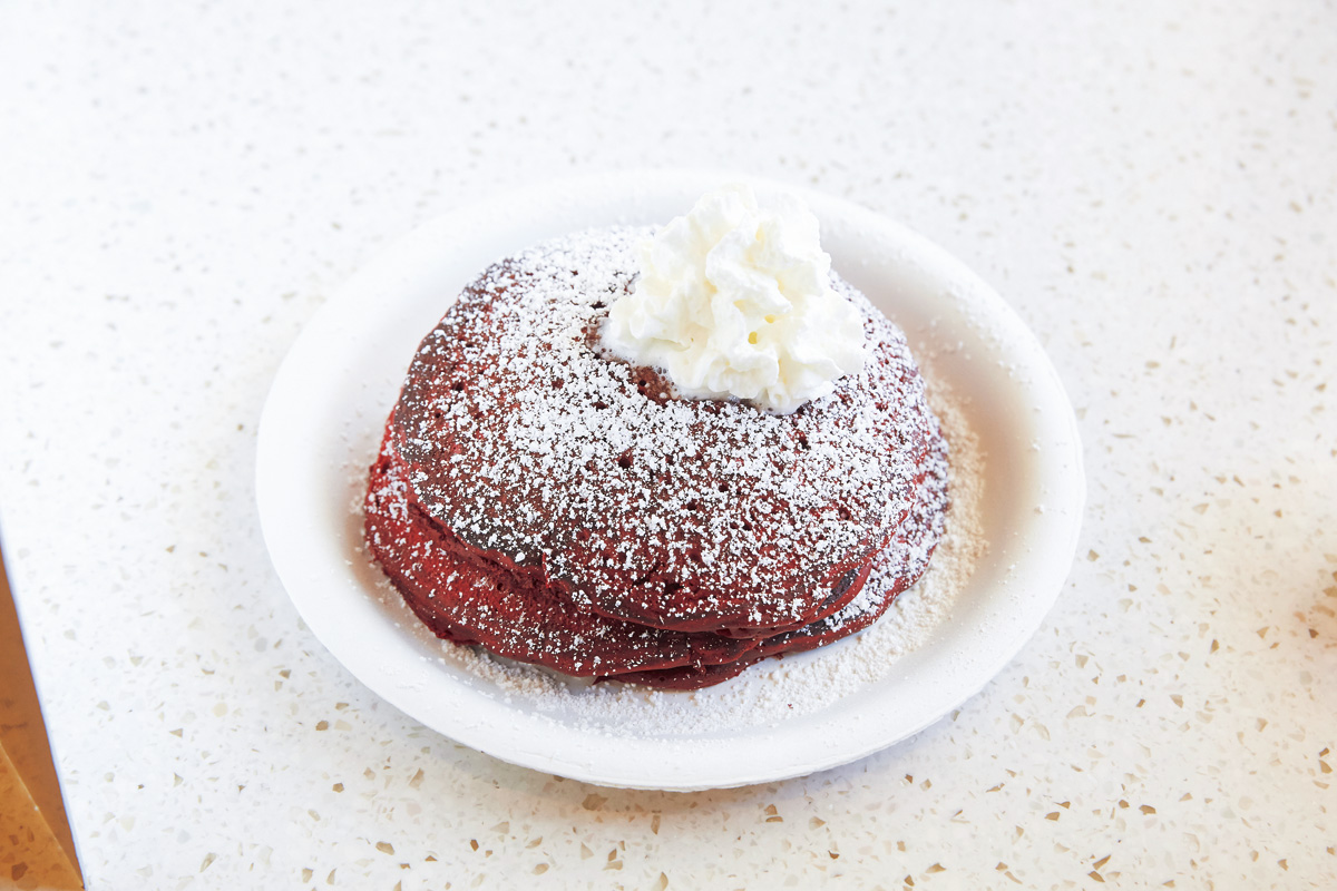 レッド・ベルベット・パンケーキ(3枚)$5.50は、アメリカ人の大好きなレッド・ベルベットケーキをパンケーキにアレンジし、連日口コミでいっぱい!ベルベットのような赤く質感の高い生地に、白いホイップクリームと雪のようにかかるパウダーがキレイに映えちゃいます。豊富なメニューで目移りもしてしまいます。