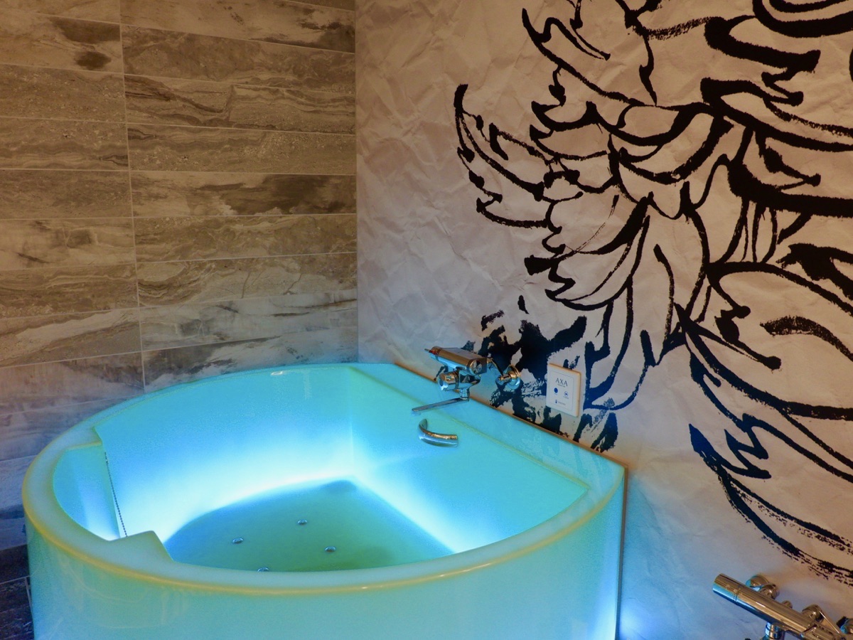 ガラス張りのバスルームには青く光るジャグシーバスが!こちらは「ホタル仕様」という、青いホタルのように発光する浴槽を採用しています。
