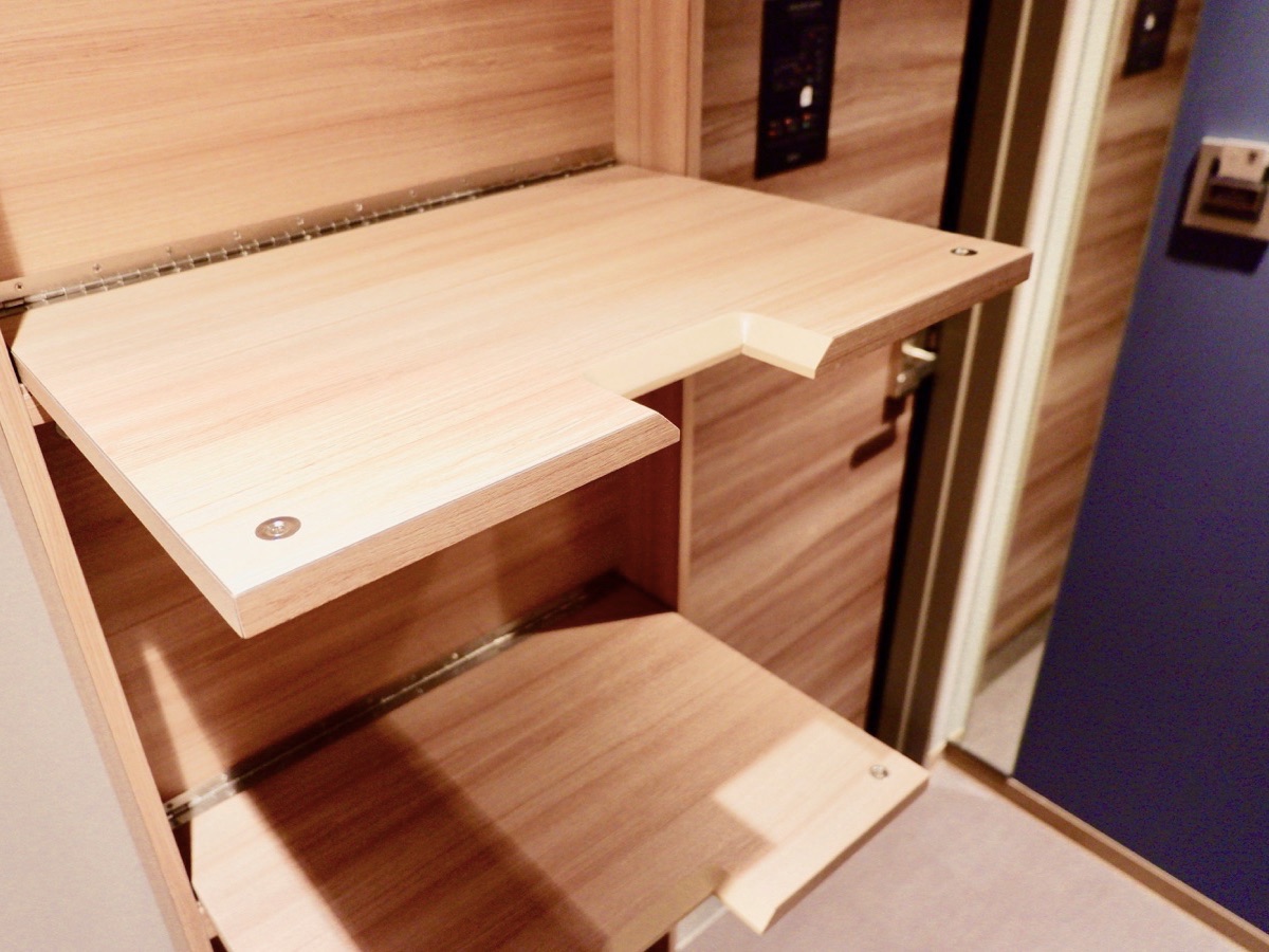 客室の入り口には折りたたみ式のボードが設置されており、スタッフと対面せずにトレイの引き渡しができるという工夫も。お風呂上がりや寝起きですっぴんの場合でも安心ですね。