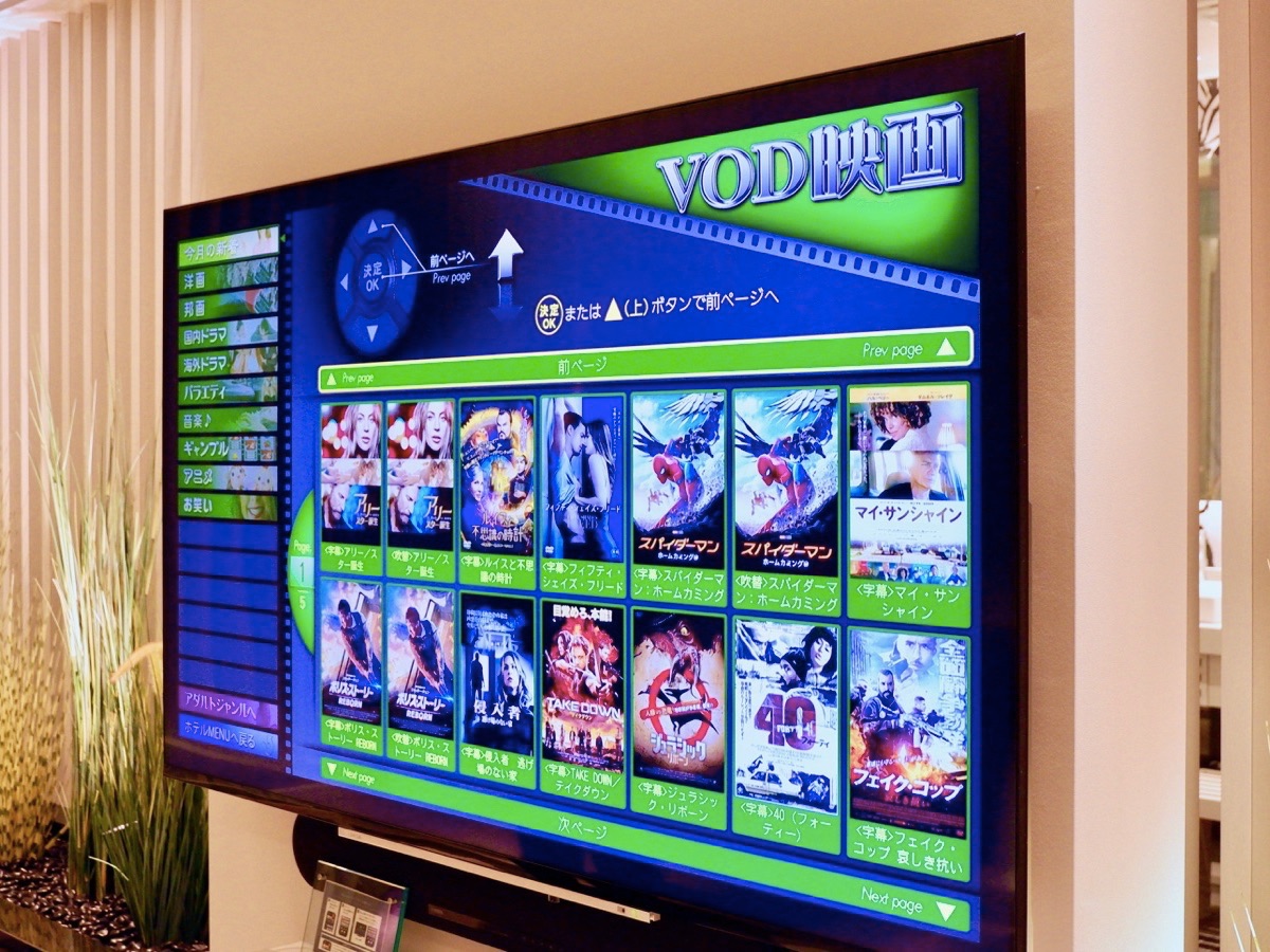 60インチの大型テレビには「ビデオ・オン・デマンド(VOD)」 を導入しており、数多くの映画やドラマが配信されています。