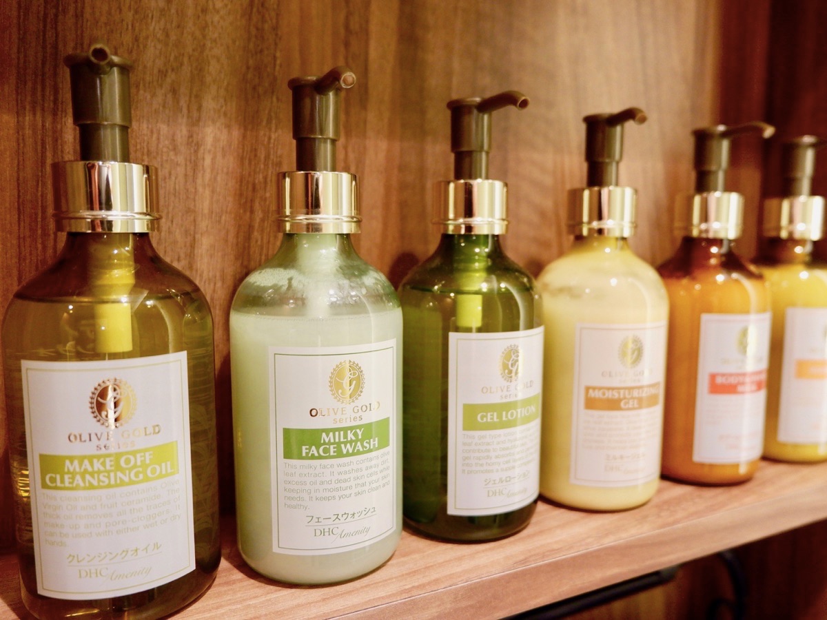 アメニティには「DHC」のスキンケア&ヘアケアシリーズ「オリーブゴールドシリーズ」がずらり!