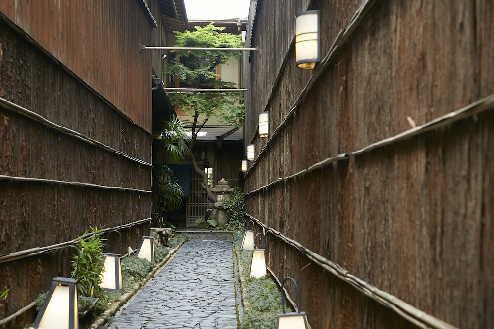 店の門をくぐると、杉皮の塀に囲われた石畳の小路がお出迎え。京都らしい情緒にワクワク感を募らせながら、母屋の玄関まで歩きましょう。