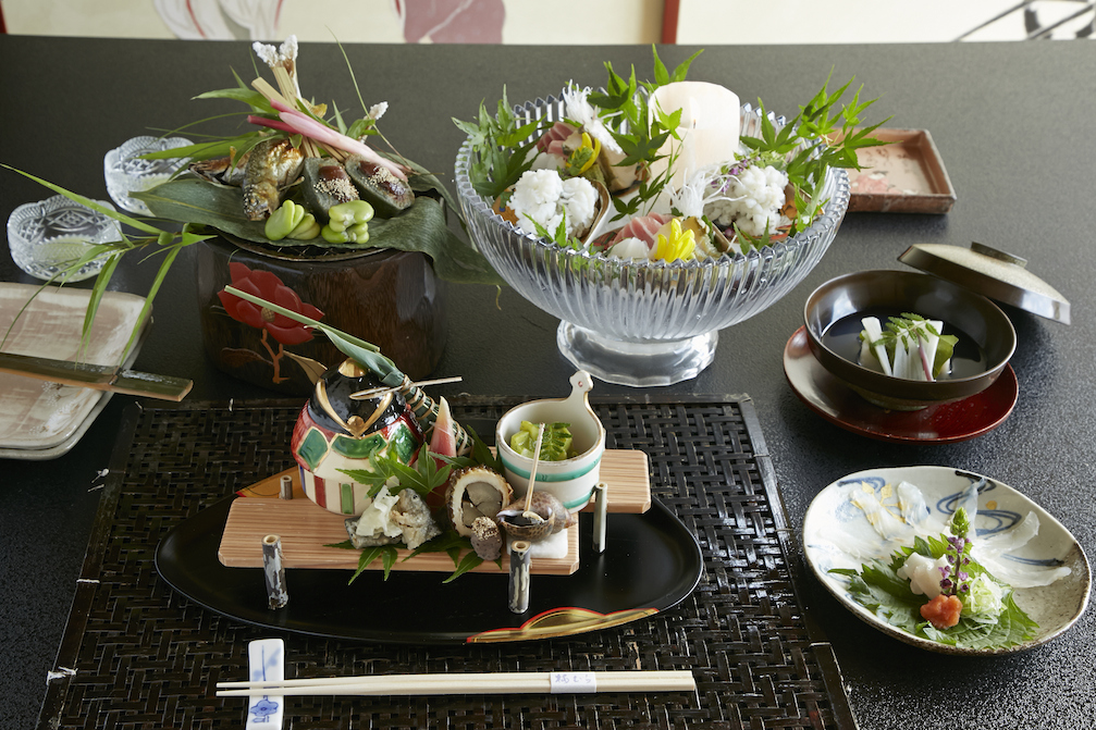梅むらの川床ディナーは1万3000円(税・サービス料込)。夏季に旬を迎える鮮魚や京野菜をふんだんに使い、食材本来の持ち味を生かした正統派の京料理がいただけます。華やかな盛り付けも魅力的なので、食べる前にカメラの準備をお忘れなく!