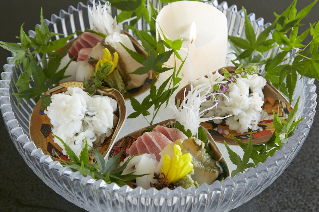 造りは、ハモや中トロなど4種前後の盛り合わせ。旬の魚介を抜群の鮮度で堪能することができます。ロウソク立てに大根の桂剥きが使われていたり、造りが絵付けした貝殻に盛り付けられていたりと、随所に遊び心が感じられる一品です。