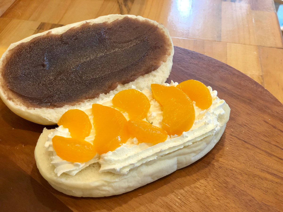 こちらのコッペパンは、とてもきめの細かいふわふわの生地!そこに黄桃・みかんをホイップクリームと挟んだのが「フルーツ」。