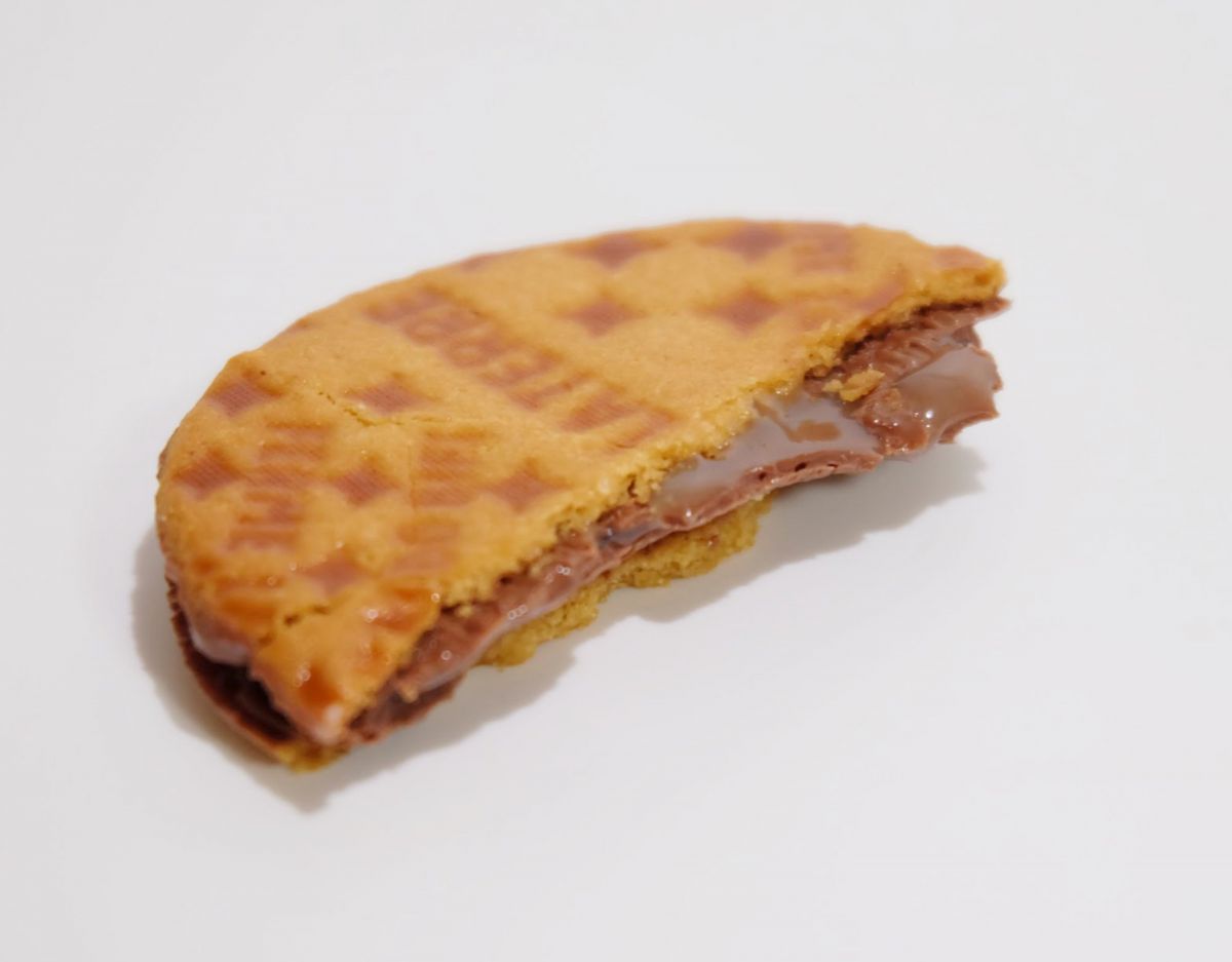 サクサクのクッキーにはさまれたクリームは、チョコレートでコーティングされています。実はなかに練乳ミルクソースが入っており、とろりとした食感とミルキーな味わいが隠れているのです。