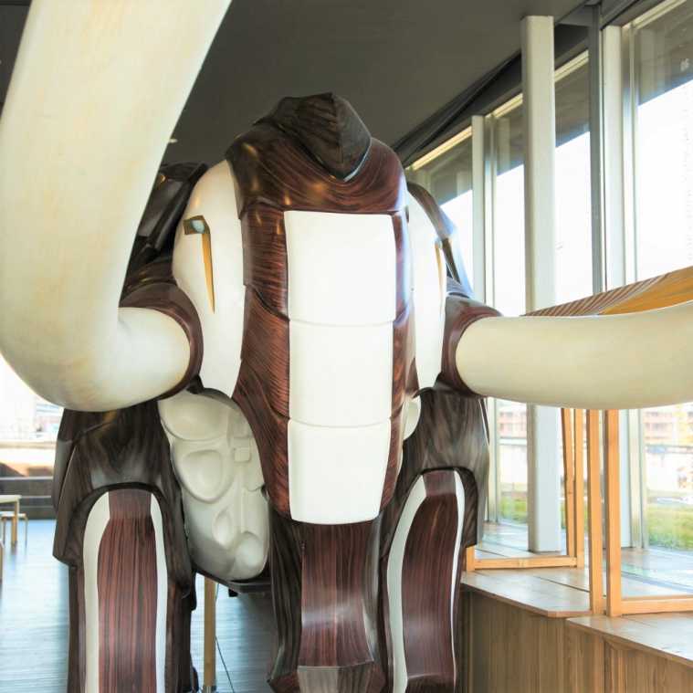 店内には現代アートが満載!なかでもこのゾウはインパクト大で、牙の存在感がものすごい!全長は6mもあるんですって。