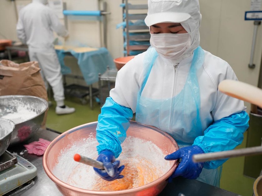 なんと「八天堂」の「くりーむパン」に入っているクリームはすべて手作り!人の手で丁寧に作られている様子を見学できます。