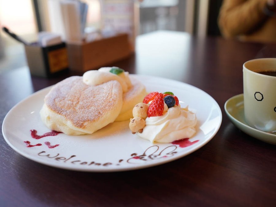 また、工場に併設されたカフェ「八天堂カフェリエ」では、さまざまなスイーツやドリンクを楽しむことも。「くりーむパン」にも使われているクリームと一緒にいただく「カフェリエこだわりパンケーキ ドリンク付き」(1300円)がおすすめです。