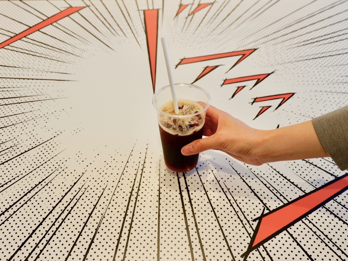 2階のフロントに行くと、天井や壁、テーブルにまで漫画のコマがあふれています!