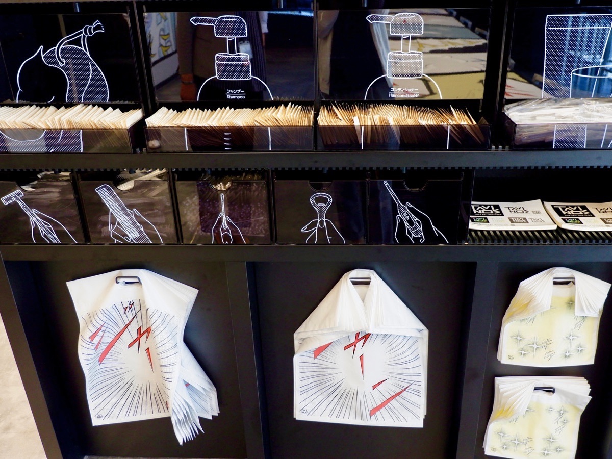 アメニティは、フロントのアメニティボックスから自分が必要な物を自由に取ることができます。イラストで表示されているので、どこに何が置かれているのかすぐに分かりますね。