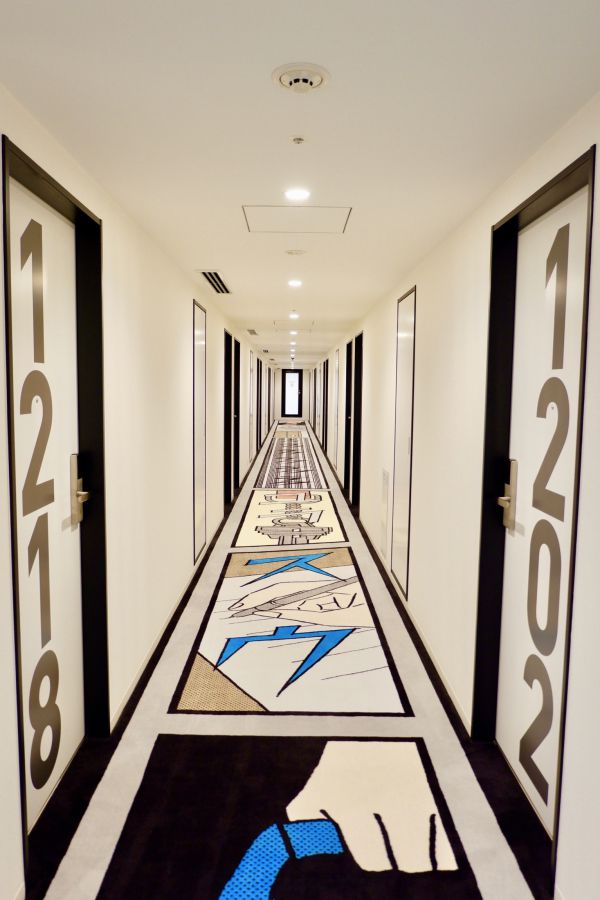 客室フロアの廊下にも、ゲストが荷物を持って客室に入るまでの様子が描かれています。すぐに自分の客室を見つけたとしても、ついつい読み進めたくなってしまう仕掛けです。